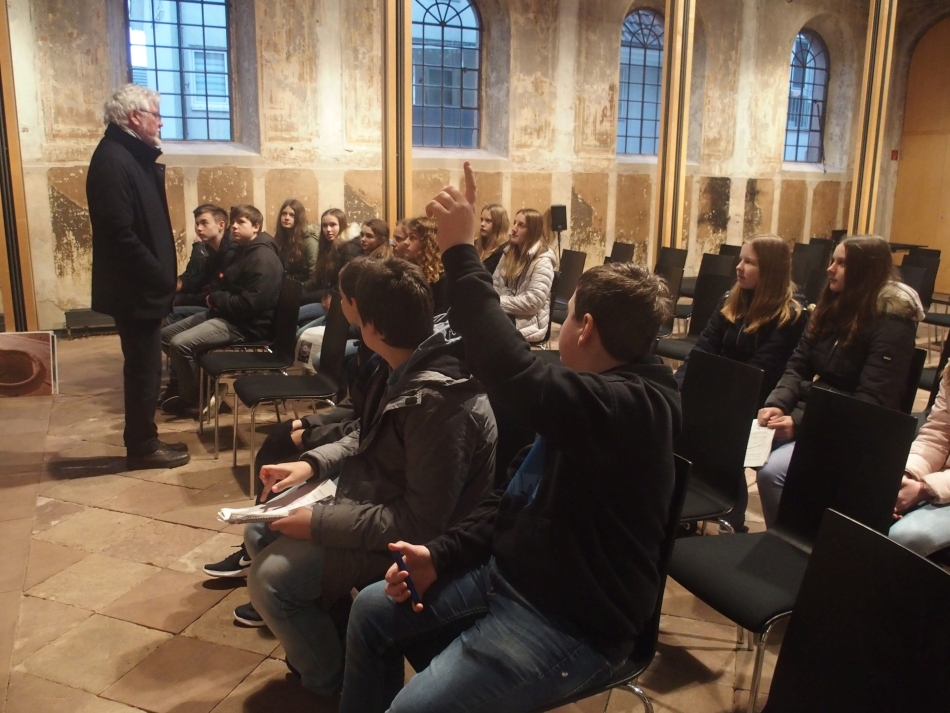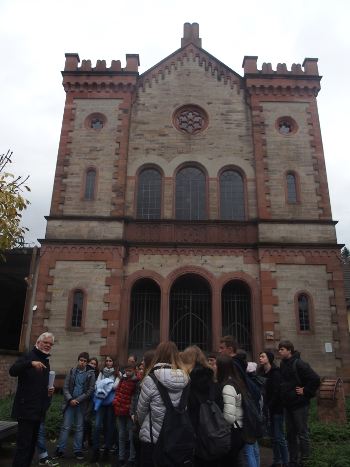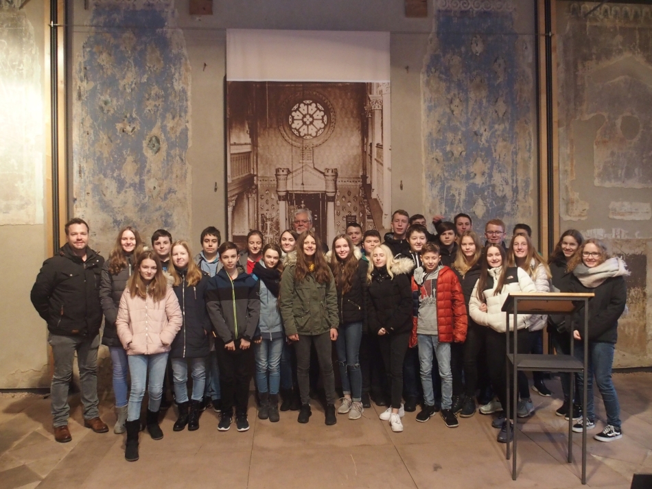 Während die erste Gruppe dann mit Herrn Stude die Synagoge betrat, ging die zweite Gruppe auf Erkundungstour durch Kippenheim, um die dortigen Stolpersteine zu finden, und sich mit den Schicksalen der deportierten Juden zu beschäftigen. In der Synagoge erhielten die Schülerinnen und Schüler bei einer Führung jede Menge Informationen über das einstmalige jüdische Leben in der Ortenau und die bewegende Geschichte des Gebäudes. Danach tauschten beide Gruppen und im Anschluss gab es noch viele Fragen, die Herr Stude bereitwillig und kompetent beantwortete. Die Klasse R8b möchten sich bei Herrn Stude für diesen sehr interessanten Tag in Kippenheim ganz herzlich bedanken.