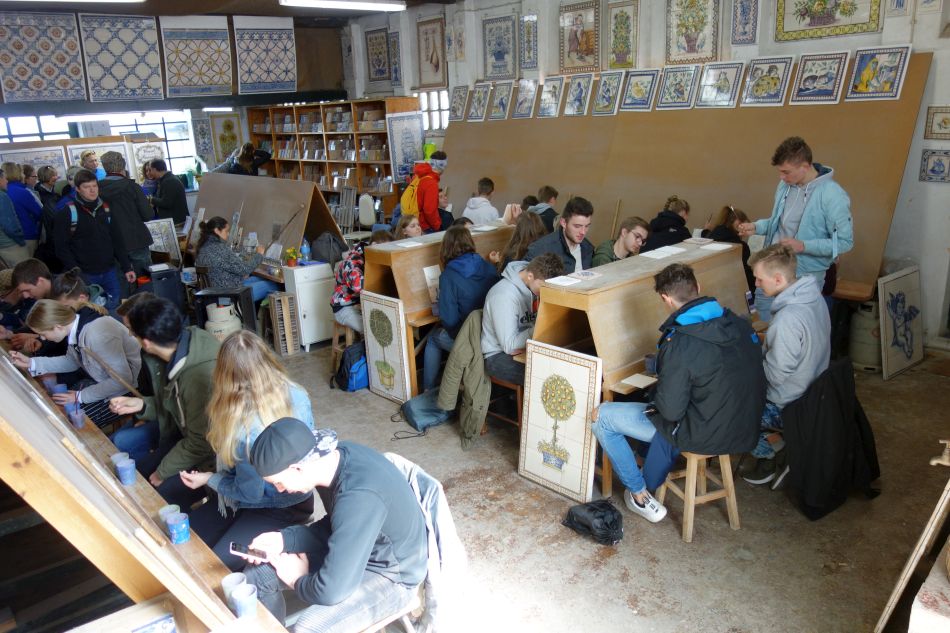 Traditionsgemäß werden in Lissabon die Häuser von außen nicht verputzt, sondern mit Kacheln verkleidet. Am Dienstag stand für uns ein Ausflug in eine „Kachelfabrik“ auf dem Programm, in der solche Kacheln von Hand mit verschiedenen Mustern und Symbolen bemalt werden. Wir bekamen dort eine kurze Einführung und erfuhren viel über die Tradition und Geschichte der Kacheln in Portugal. Danach durfte sich jeder ein Motiv auswählen, um eine eigene Kachel zu gestalten. Allerdings konnten wir diese nicht gleich mitnehmen, da sie zuerst gebrannt werden mussten (wir bekamen sie dann ein paar Tage später mit dem Bus geliefert). Am Abend genossen wir am Meer kleine Puddingtörtchen, die portugiesische Spezialität schlechthin.