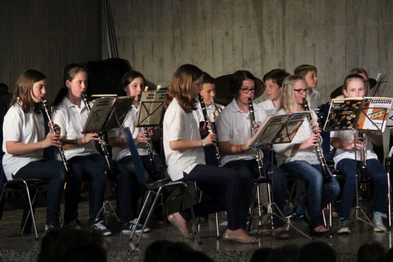 Zuerst spielte die fünfte Klasse unter der Leitung von Bernhard Wagner – das war erst der dritte Auftritt der Klasse. Gespielt wurden Stücke für ganze Blasorchester. Von Old McDonald bis zum Bananaboat Song war alles dabei.