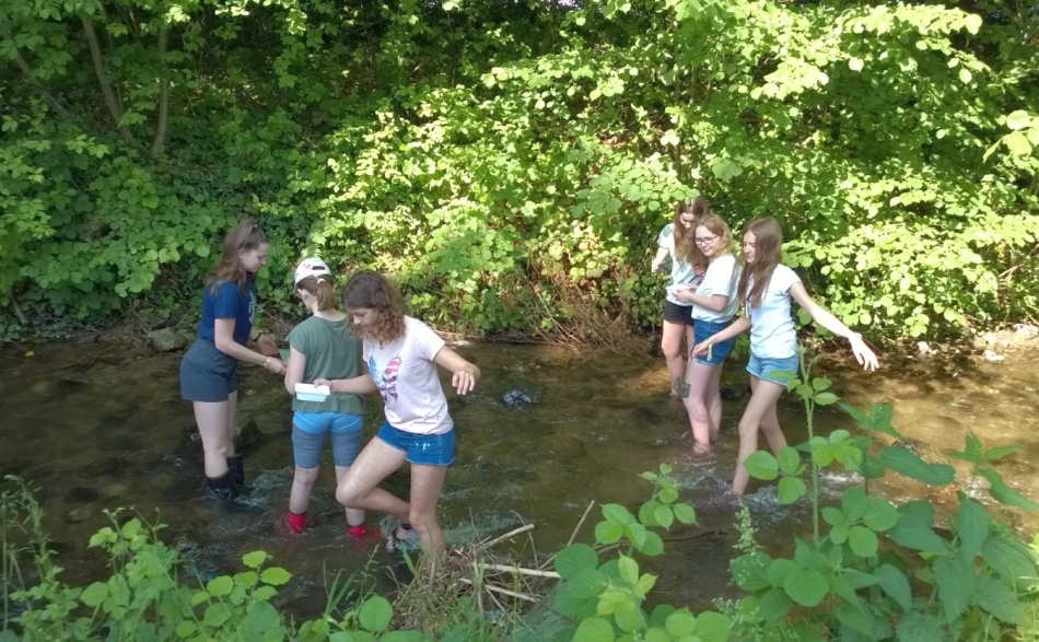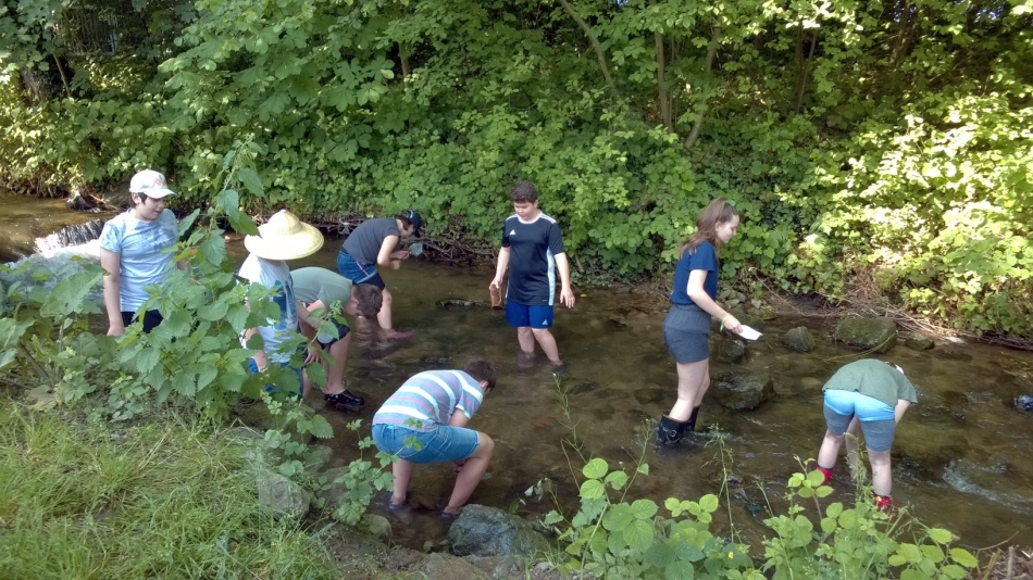 Im Verlauf der Thementage machte die Klasse R7b sich auf die Suche nach Tieren, die sich unter Steinen in einem Fließgewässer verstecken. Bei zum Glück warmen Wetter ging es mit Zug, Straßenbahn und zu Fuß nach Freiburg zum Waldhaus. Dort wartete die Expertin des Waldhauses mit Keschern auf uns. An flachen Stellen ging es wagemutig in das eiskalte Wasser und gemäß der von der Expertin erklärten Methode fingen wir mit steigender Begeisterung Eintagsfliegenlarven, eine Steinfliegenlarve, Köcherfliegenlarven und viele Bachflohkrebse. Mit unserem Fang ging es ins Labor des Waldhauses zurück, um die kleinen Tierchen unterm Binokular anzuschauen, dann mit Bestimmungshilfen den Namen festzulegen, eine Zeichnung anzufertigen und den Fang bezüglich Gewässergüte auszuwerten.