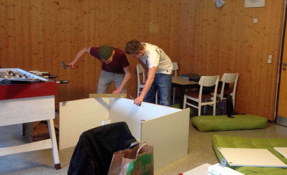 Leon: Mir geht es ähnlich, wenn ich da reinlaufe in Freistunden, dann haben wir, die Leute die daran mitgearbeitet haben, eine sehr starke Bindung. Ich fühle mich, auch wenn es sich komisch anhört, (*lacht*) wie der Papa, der das eigenhändig aufgezogen hat. Vor allem der letzte Feinschliff, als wir alles aufgeräumt haben, die Möbel standen noch kreuz und quer, die Raumaufteilung war nicht sicher, als wir das in den Ferien gerichtet haben, ist dieser Raum für mich richtig entstanden. Ab da habe ich mich so richtig verbunden mit dem Raum gefühlt und man hat endlich das Ergebnis vor sich und ist stolz und denkt: „Geil, das haben wir alle zusammen gemacht“ und diese Gefühl habe ich jedes Mal, wenn ich da unten reingehe. Ich bin froh, wenn andere Leute aus dem Kurs oder aus der alten Klasse auf uns zukommen und sagen: „Oha, das ist richtig cool“. Oft sind Leute beeindruckt von der Küchenzeile oder der Chillecke und freuen sich. Bislang gab es noch keine große Verschmutzung, alle passen auf und verhalten sich anständig. Wir müssen natürlich sehen, wie es ist, wenn die nächste Generation damit umgeht. Ich hoffe natürlich, dass die genauso sorgfältig damit umgehen wie wir, wenn man an die Vernunft appelliert und sagt: Leute das ist euer Raum, wenn ihr den kaputt macht und zerstört, dann wird der geschlossen und ihr habt ihn nicht mehr. Ich wünsche mir, dass alle gut auf den Raum aufpassen, damit der uns lange erhalten bleibt und so denke ich, wird es auch hoffentlich sein.