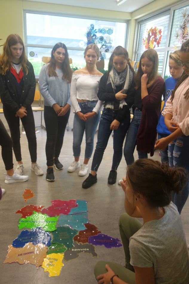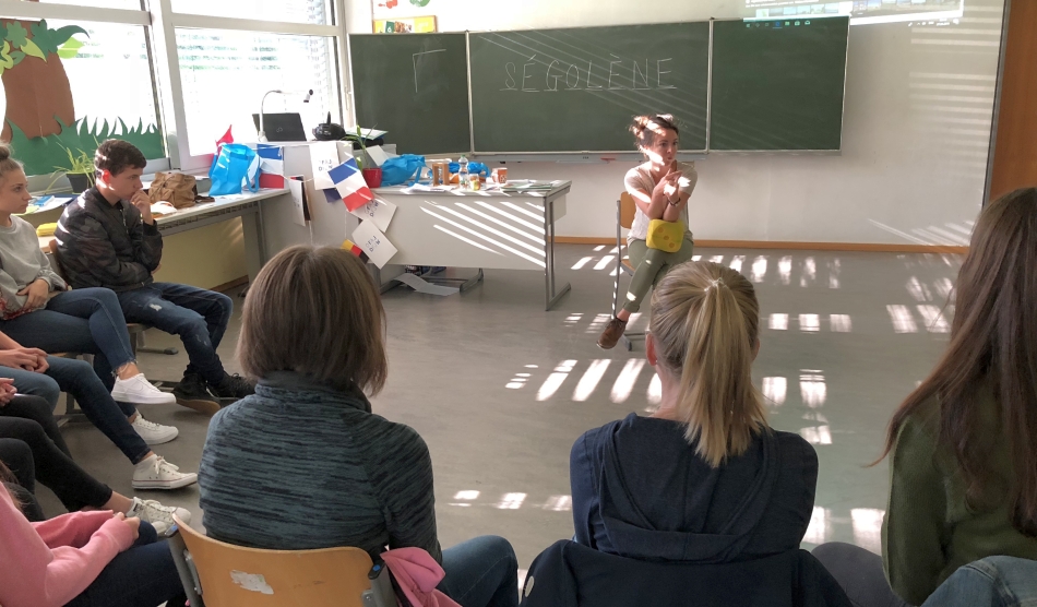 Ségolène Bulot, Lektorin aus Frankreich und Vertreterin des FranceMobil-Programms im Großraum Freiburg, präsentierte den teilnehmenden Klassen der Klassenstufe 7 bis 9 eine Kombination aus kultur-, kreativitäts- und kommunikationsorientierten Aktivitäten. Zum Einsatz kamen dabei sowohl Spiele, Bilder und aktuelle frankophone Musik als auch pantomimische und theaterdidaktische Lehr-Lern-Elemente. Das thematisch ebenso impuls- wie abwechslungsreiche Programm motivierte die Schülerinnen und Schüler dazu, einen vertieften Blick auf das Nachbarland Frankreich zu werfen: gesellschaftlich, landeskundlich und nicht zuletzt zielsprachlich.