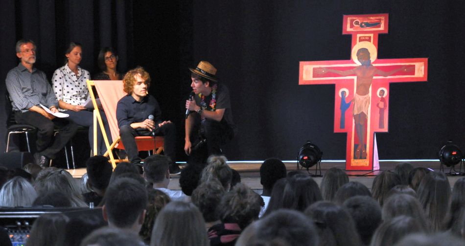 Das Schuljahresende war für die Schulgemeinde ein Anlass, auf die vergangenen Monate zurückzublicken. In den gemeinsamen Schulgottesdiensten aller Schülerinnen und Schüler sowie Lehrerinnen und Lehrer stellte das Team der Religionslehrerinnen und Religionslehrer das Wort „Umsonst“ in den Mittelpunkt: Wie oft hatten wir im vergangenen Schuljahr das Gefühl, uns umsonst zu bemühen, umsonst gelernt zu haben, uns umsonst umeinander zu kümmern? Aber: Wie oft wurden uns auch kostbare Momente „umsonst“ geschenkt: Momente der Begegnung, des Erfolgs, der Ermutigung? So gab es in den Gottesdiensten Raum, in der Stille und beim gemeinsamen Singen mit der TAU-Band über das vergangene Schuljahr nachzudenken. Anschließend wurde das Schuljahr in den Klassen mit den Klassenlehrern beschlossen, die Zeugnisse überreicht sowie Lobe und Anerkennungen für besondere Leistungen ausgesprochen.