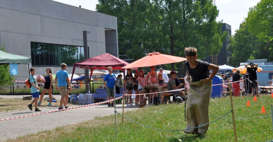 Die Anspannung der letzten Wochen scheint plötzlich vergessen, wenn alle gemeinsam feiern und dabei erfahren, was sich entwickeln kann, wenn sich so viele für das Gelingen einsetzen.  Das große Engagement der Eltern, die dabei zusammen mit ihren Kindern für das leibliche Wohl, aber auch für Spiel und Unterhaltung sorgten, sind ein Zeichen großer Verbundenheit und Identifikation mit der Heimschule. So konnte man verschiedene Leckereien wie Waffeln, Sandwichs oder Cocktails genießen, sich am Spielestand im Dosenwurf oder Sackhüpfen messen oder einfach auf der Wasserrutsche eine kühle Erfrischung genießen. Ein vielseitiges Programm, das wirklich für jeden etwas zu bieten hatte.