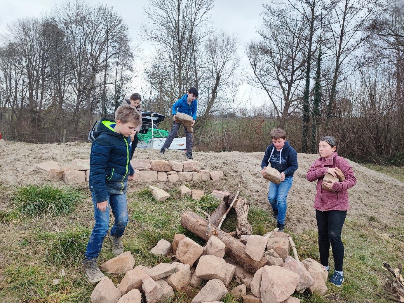 Der nach Süden weisende Sandwall war über die Jahre zugewachsen. Die Schülerinnen und Schüler der Naturschutz-AG entfernten mit Hilfe von Herrn Bing die Pflanzen und ergänzten den Wall durch eine Trockenmauer und Totholz, sodass auch Reptilien hier einen Rückzugsort finden. Der Frühling kann kommen und die neuen Bewohner einziehen.