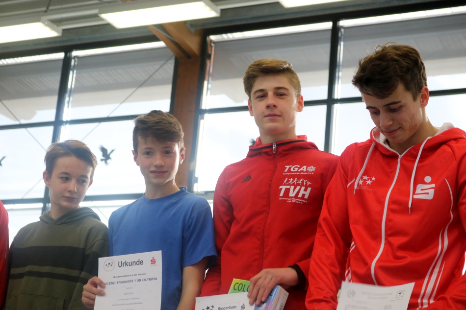 Der Austragungsmodus der Wettkämpfe bei „Jugend trainiert für Olympia“ kann bei geringer Teilnehmerzahl von den RP-Beauftragten in Zusammenarbeit mit den Kreisbeauftragten abgeändert werden. Somit war das RP-Finale für die Kunstturner Robin Karner, Simon Herzog, David Schweizer, Paul Herrmann, Ruben Hanke erst der zweite Wettkampf. Aus dem Kreisfinale in Friesenheim im November 2018 waren sie als souveräner Sieger im Wettkampf I (Kürwettkampf-Jahrgangsoffen) hervorgegangen. In Spaichingen musste die Mannschaft leider auf Robin Karner verzichten und Simon Herzog konnte verletzungsbedingt nur am Reck antreten, zeigte da aber eine sehr gute Übung. An drei Geräten waren sie somit nur zu dritt und jeder kam in die Wertung. In einem etwas nervenaufreibenden Wettkampf konnte die Mannschaft dann aber doch mit drei Punkten Vorsprung zum Zweitplatzierten aus Rottweil das oberste Treppchen des Siegerpodestes erreichen und damit die Qualifikation für das Landesfinale.