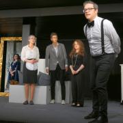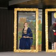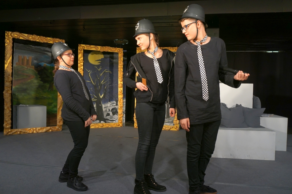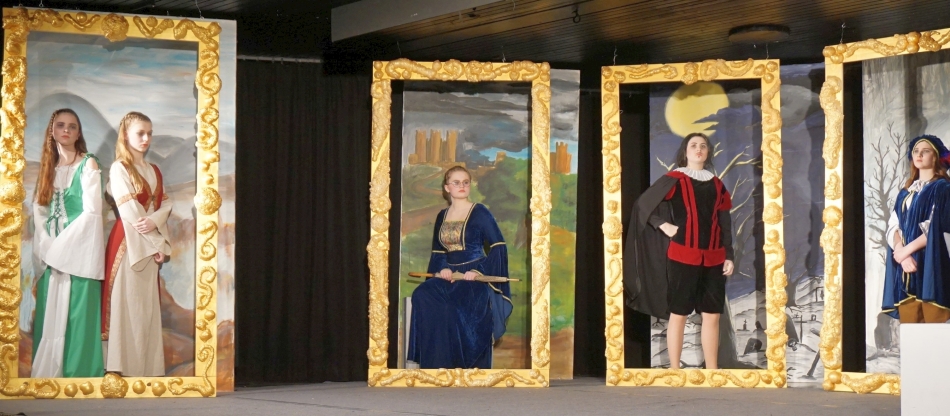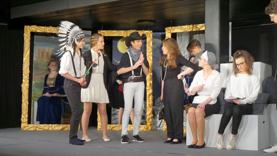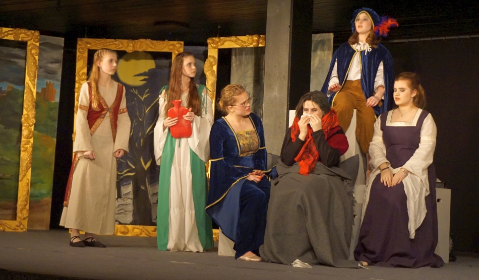 Die Theater-AG unter der Leitung von Sandrine Remmeau und Daniel Kurz brachte diesen Spielwitz in zwei sehr gut besuchten Aufführungen hervorragend auf die Bühne. Die Erzählung spielt in einem englischen Schloss, etwas gespenstisch und typisch britisch zieht Nebel auf. Auf der Bühne dominiert die Ahnengalerie: lebensgroße beleuchtete Bilder mit Ahnen, die immer wieder auferstehen und mitspielen – eine raffinierte choreographische Idee des Regieteams mit einem eindrucksvollen Bühnenbild (Bernhard Fehling mit der R7 und Franz Ostermann mit der G10).