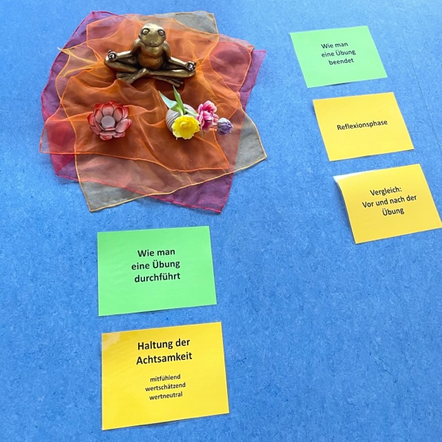 Sonja Haag, die selbst durch Christopher Willard zur Achtsamkeitslehrerin ausgebildet wurde, leitete hierzu mit einer Vielzahl verschiedener Achtsamkeitsübungen die Kursteilnehmerinnen und -teilnehmer dazu an, inmitten des trubeligen Schulalltags innezuhalten, im Moment anzukommen, die eigenen Emotionen wahrzunehmen und sich über die jeweiligen Erfahrungen auszutauschen. Dabei verloren sich die Teilnehmerinnen und Teilnehmer im wirbelnden Glitzermoment des Zauberglases, praktizierten die fünf Fingeratmung, erlebten sich als Spiderman, lauschten dem verklingenden Ton der Klangschale und klopften sich den Alltag aus Armen und Beinen.