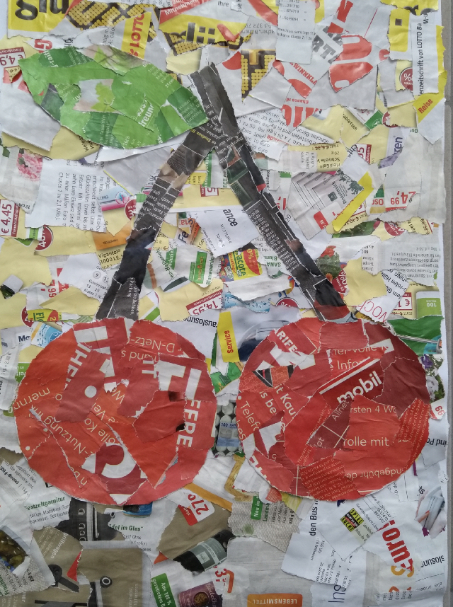 Im häuslichen Kunstunterricht von Dana Wurth erstellten die Schülerinnen und Schüler der G5a Obst-Collagen und Zeitungstitelseiten. Hier sehen Sie die Arbeiten von Helena Marschinke, Eva Kölblin, Emily Reihmann und Josefine Jäger.