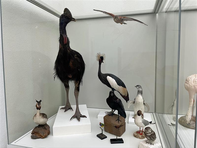 Und falls ein während der Evolution erfundenes Merkmal nicht mehr gebraucht wird, dann entwickelt es sich zurück – schließlich verursacht es sonst Kosten für das Individuum, die eingespart werden können. Ein gutes Beispiel hierfür ist der Helmkasuar, ein großer Laufvogel, der in den Tropenwäldern Australiens lebt und nur noch kleine Stummelflügel besitzt, da er zum Fliegen zu schwer ist und die Flügel im Regenwald nur hinderlich wären. Eine perfekte Angepasstheit an seinen Lebensraum – Evolution eben. Dieser imposante Vogel ist nur eines der ausgestopften Exponate im Museum.