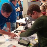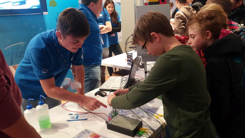 Mit dem thematischen Schwerpunkt der Elektrizität konnten die Schülerinnen und Schüler an über 120 Ständen experimentieren, bauen, hinterfragen und forschen. So konnten sie das Geschicklichkeitsspiel „Heißer Draht“ selbst zusammenbauen und mit nach Hause nehmen, sich mit chemischen oder physikalischen Analysemethoden auf Spurensuche in Kriminalfilmen begeben oder ihre Lieblingsmusik durch Unterbrechung des Stromflusses durch ihre eigenen Körper stoppen oder spielen lassen und und und…