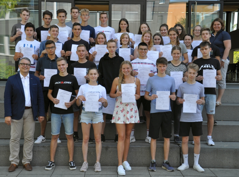 In einer kleinen Feierstunde am Dienstag vor den Sommerferien konnte Schulleiter Eberhard Pfister 52 Schülerinnen und Schülern der Klassenstufe 10 die DELF-Zertifikate überreichen und zum Bestehen dieser anspruchsvollen Prüfung gratulieren. Das beste Ergebnis der Prüfung erzielte Amelie Pfister (G10c) mit 98 von 100 möglichen Punkten.