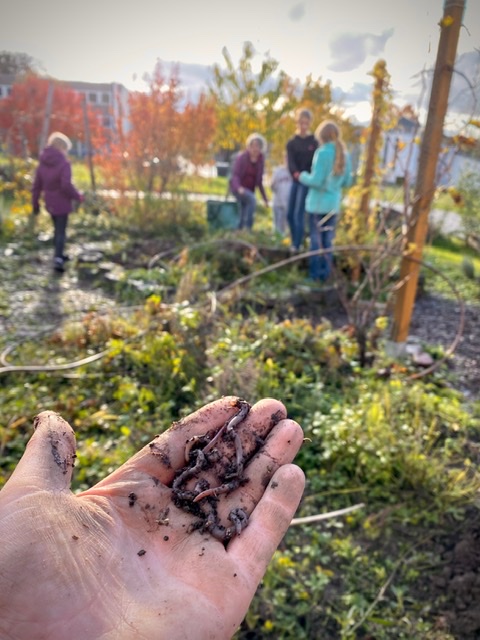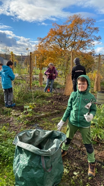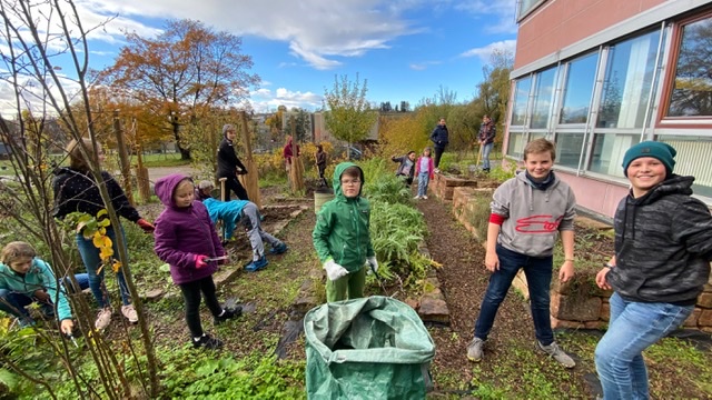 In den letzten Wochen konnten noch Kürbisse und Physalis geerntet werden, dann wird der Schulgarten winterfest gemacht. Dabei werden Stauden und Sträucher zurückgeschnitten und einjährige Pflanzen aus den Beeten entfernt. Alles wird einmal umgestochen, der Rasen ein letztes Mal gemäht und die Wege von Unkraut befreit. Außerdem müssen alle Werkzeuge und Gartengeräte gut gesäubert und das neue Gartenhäuschen aufgeräumt und ausgekehrt werden. Ganz schön viel Arbeit!