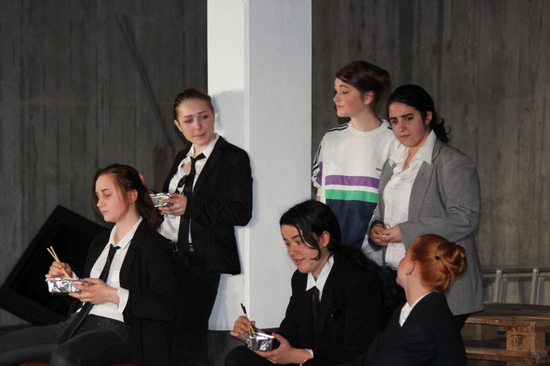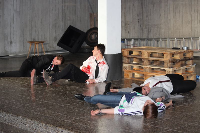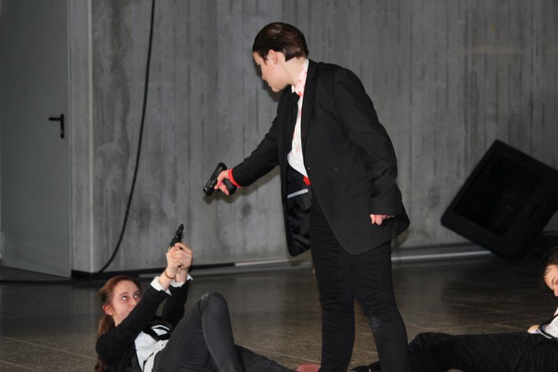 In den Rollen der coolen, harten Jungs glänzten fast ausschließlich Mädchen, Sophie Zipf als Mr. White , Jessika Fink als Mr. Pink, Amelie Croin als Mr. Blonde, Jasmin Foßler als Mr. Brown und Olivia Altfuldisch als Mr. Blue. Mit einer diesem Milieu typischen Mimik und Gestik und einem entsprechend rüden und teils sehr lauten Umgangston spielten sie die knallharten Gangster überaus überzeugend. Auch bei den zahlreichen heftigen Wortgefechten blieb kein Zweifel, dass man es hier mit eiskalten Typen zu tun hat. Eine großartige Leistung bot auch Denise Freudenstein als kaltblütiger und unnachgiebiger Boss „Joe“, vor dem jeder Angst haben muss. Hervorragend war Josef Blum als Undercover-Cop, neben Marcel Nuchov als Mr Brown und Julian Senst als Nice Guy Eddie einer der wenigen männlichen Darsteller. Er spielte den schwer verletzten, lange Zeit im Sterben liegenden Mr. Orange so großartig, dass der Zuschauer einfach mit ihm mitleiden musste. Daneben machten die Licht- und Toneffekte sowie eine gute Maske die Aufführung zu einem echten Thriller. Insgesamt bot der Literaturkurs der Heimschule wieder einmal eine Glanzleistung schulischer Theaterarbeit.