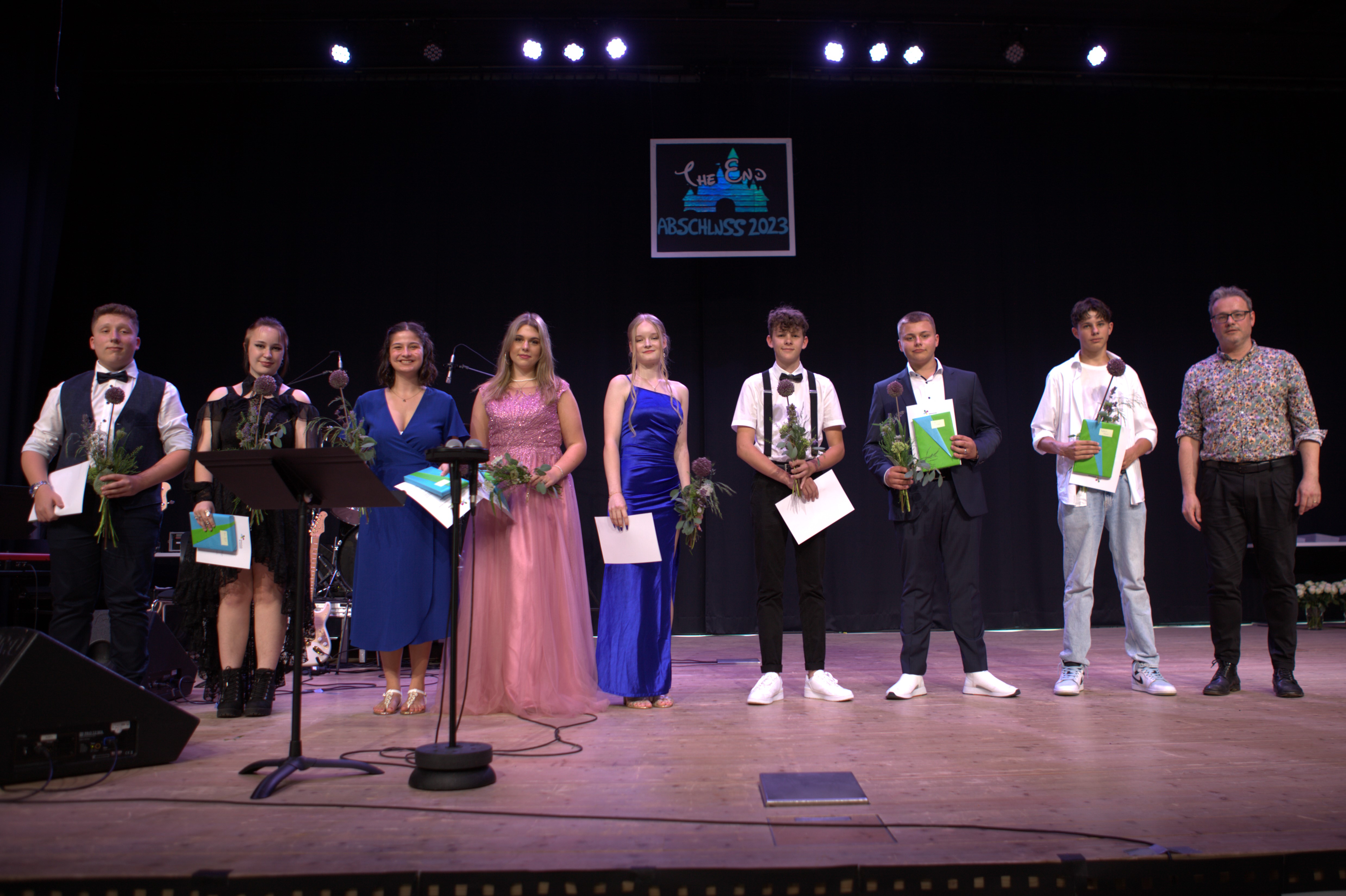 Holger Schnabel dankte im Namen des Elternbeirats den vielen Elternvertreterinnen und Elternvertretern für ihr Engagement und ihren Einsatz für die Jugendlichen im Laufe ihrer Schulzeit und wünschte allen nach der erfolgreichen Episode eine positive Fortsetzung. Zu guter Letzt blickten Vanessa Kaczuro und Nevio Nicolosi als Schulsprecher noch einmal zurück in die Geschichte der Abschlussklassen und zeichneten humorvoll die Höhen und Tiefen des Schulalltags nach. Herzlich bedankten sie sich für die jahrelange Unterstützung. Mit dem abschließenden Appell „Glaubt an euch!“ leiteten sie den Höhepunkt des Abends ein: Unter tosendem Applaus wurde den Abolventinnen und Absolventen ihr Abschlusszeugnis überreicht und die vielen Fachpreise verliehen. Konrektor Michael Kertholt, Rektorin Nicola Heckner und die jeweiligen Klassenlehrer und Klassenlehrerinnen gratulierten herzlich!