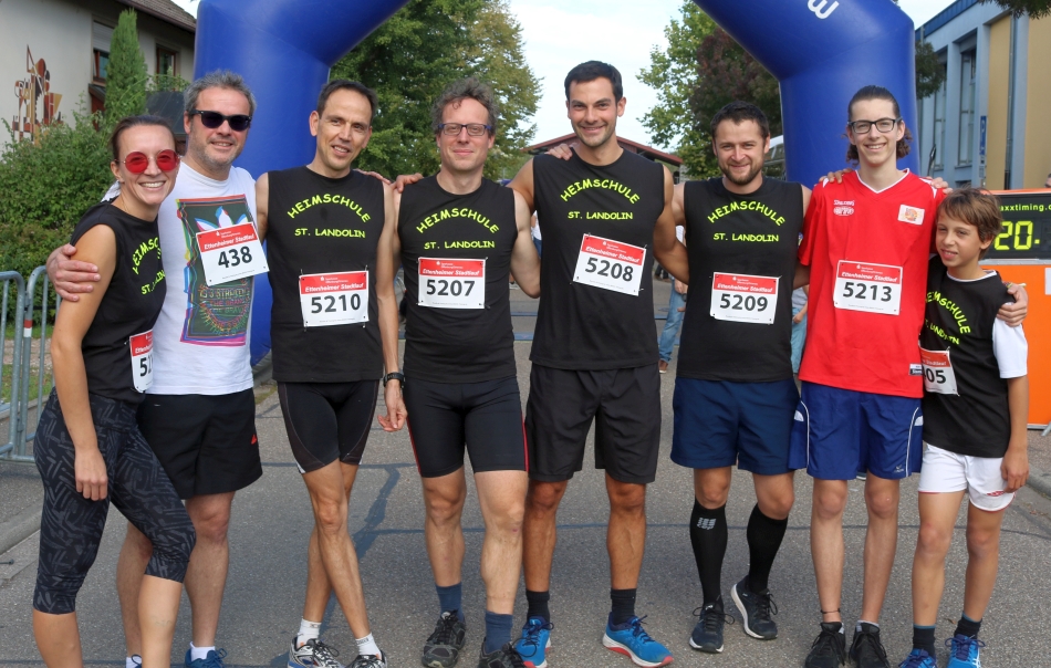 Während sich die Schülerinnen und Schüler in der Stadthalle mit isotonischen Getränken, Kuchen und Brezeln stärkten, wurden 37 Damen und 58 Herren auf die fünf Kilometer des Jedermann-Laufes geschickt. Auch hier galt es in einem Team aus mindestens drei Läuferinnen und Läufern eine gute Gesamtwertung zu erreichen. Für das Heimschulteam starteten Christiane und Daniel Kurz, Jens Kohler, Fabian Haag, Jakob Katzmann, Daniel und Anton Gaschick sowie Alwin Richard. Hinter den haushoch überlegenen Dauersiegern des Schuhhaus Oberle konnte ein 2. Platz erlaufen werden.