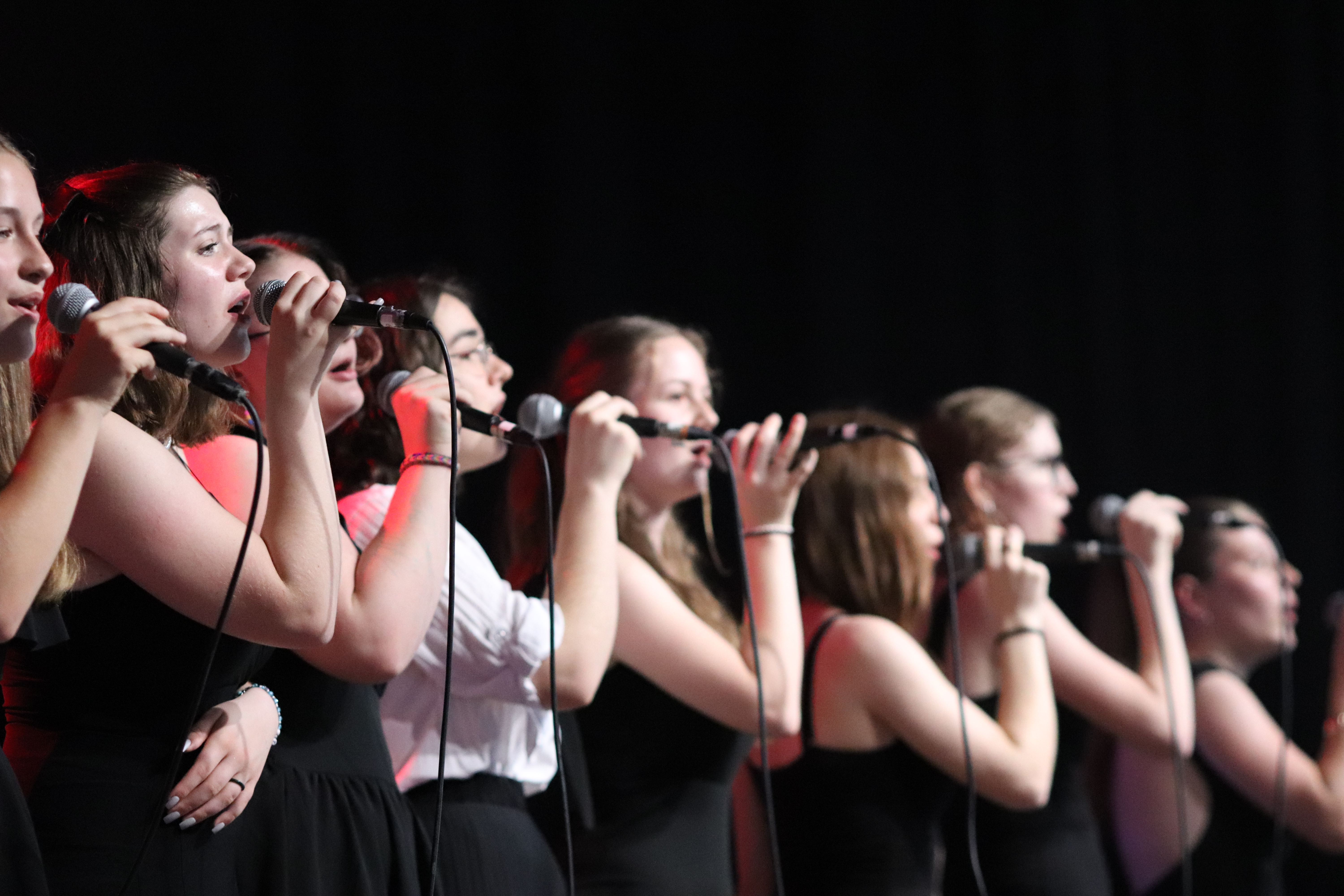 Ekaterini Kalograna und Valerie Heck kündigten den nächsten Song an – „Chasing Cars“. Bei diesem berührte Pia Schulz als Solistin mit viel Emotionalität und Schwung und brachte so das Liebesgeständnis, um welches es in diesem Lied geht, dem Publikum sehr nahe.
