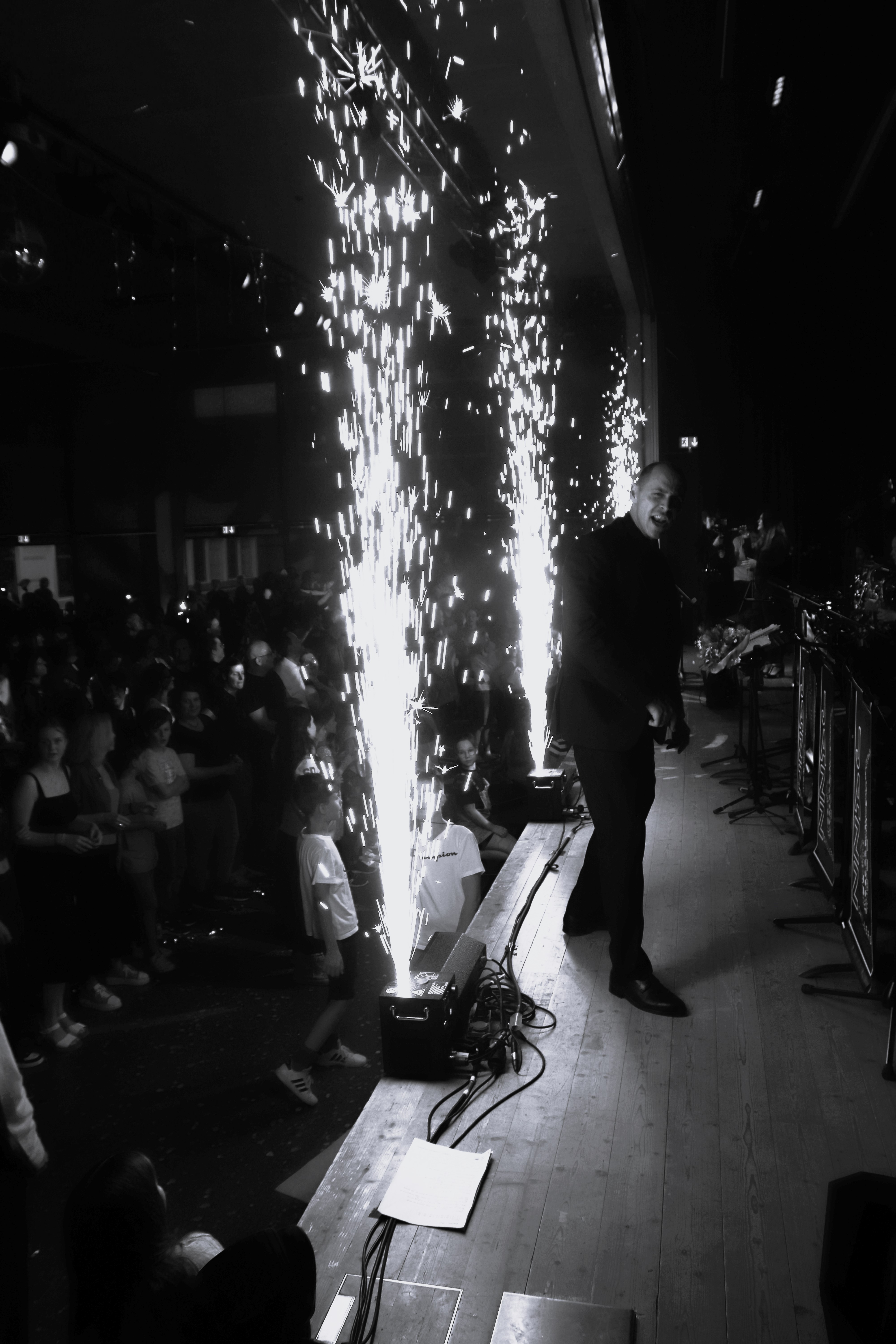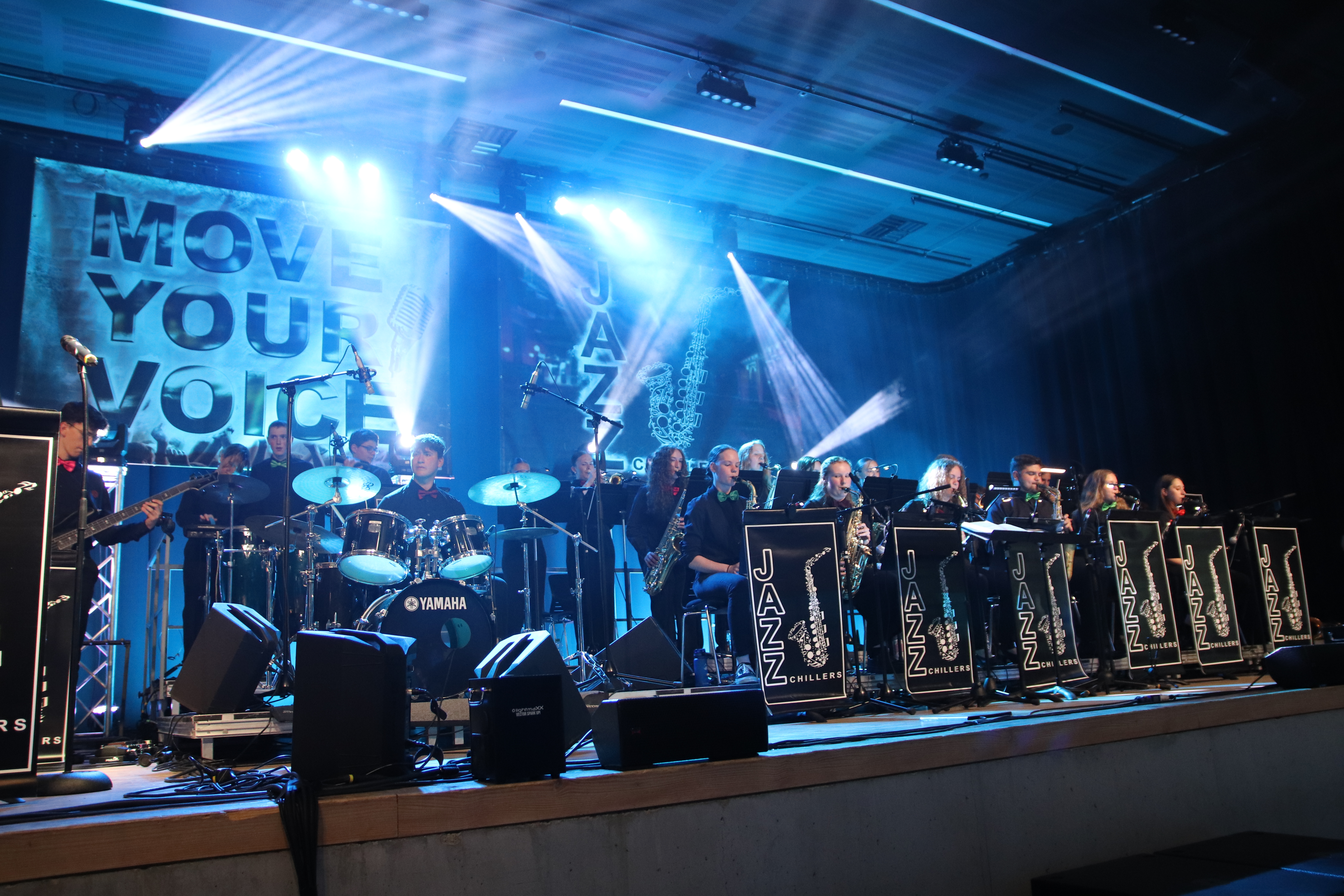 Und dann begann sie – die Show der Jazz Chillers - mit einem lauten Knall, einem geschlossenen Vorhang und einem Countdown von Bandleader Markus Albu höchstpersönlich. Dieser war mit seinen Jazz Chillern die Wette eingegangen, dass das Publikum die ersten 15 Minuten durchtanzen würde. Diese Wette sollte sich schnell erfüllen. Denn schon beim ersten Song 7 Nation und Danzer tanzte das Publikum begeistert mit. Spätestens bei „Let me entertain you“ bewegte sich die gesamte Aula. Auch dieses Mal riss Sängerin und Solistin Vanessa Müller das Publikum gemeinsam mit. Levin Müller überzeugte mit einem schwierigen Saxophon Solo und Moritz Ibert mit einem anspruchsvollen Trompetensolo.