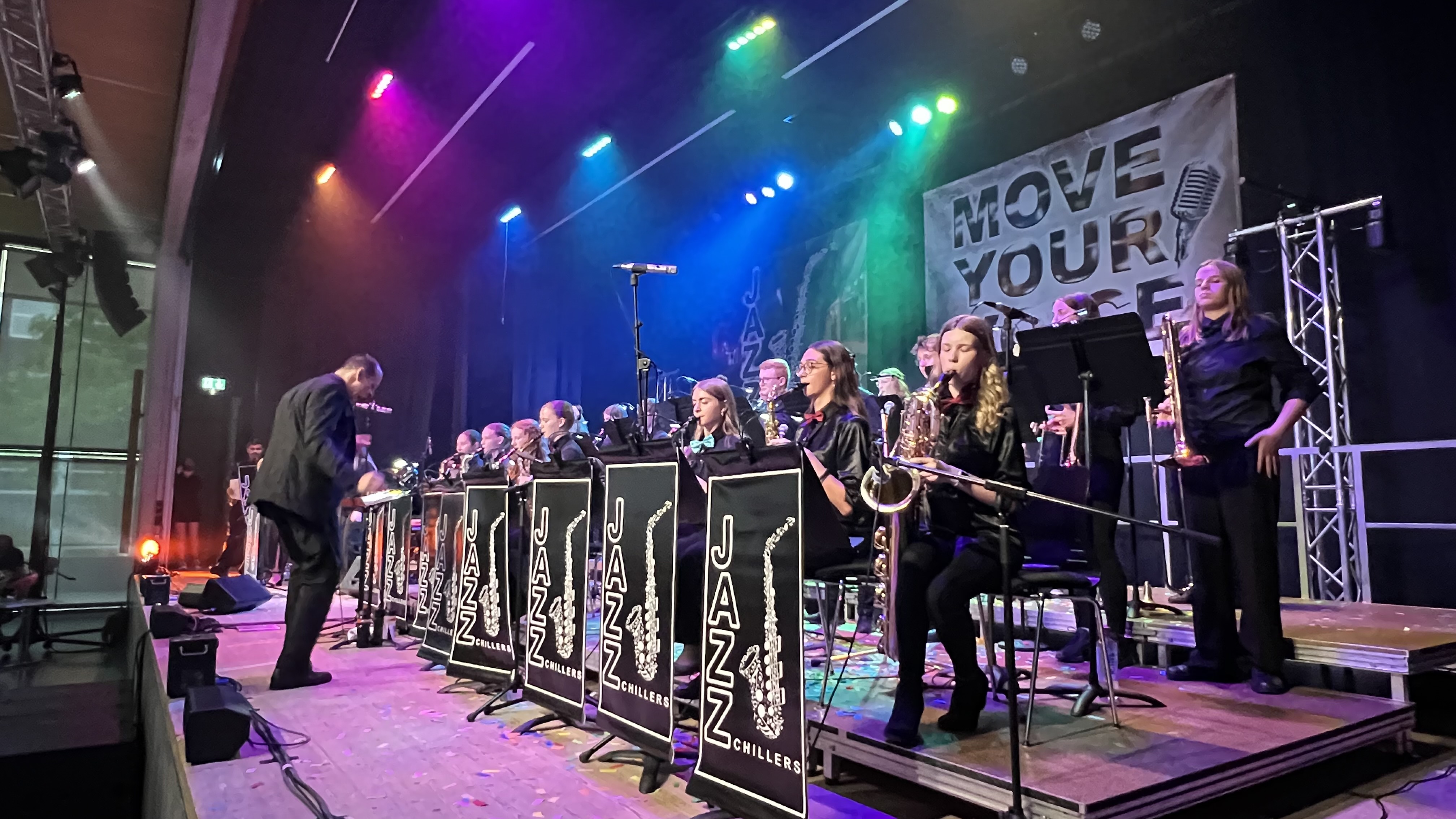 Eine Mischung aus Soul, Pop und Funk bot der ursprünglich einmal von Amy Winehouse gesungene Song „Valerie“, bei welchem Vanessa Müller dem Publikum ihre Gesangskunst schenkten und den Song allen Valeries widmete. Beim Song „Chicken“ zeigen Julia Kollmer und Levin Müller mit ihrem Unisolo am Saxofon sowie Benedikt Hirzel an der Bassgitarre ihr großes musikalisches Talent. Den groovenden Sound erhält dieses Stück nämlich ganz besonders durch seine schnellen Läufe an der Bassgitarre sowie am Saxofon. Anschließend luden die Jazz Chiller ihr Publikum dazu ein, sich mit ihnen glücklich und frei zu fühlen – und anders kann man auch gar nicht, wenn die Jazz Chillers „Feeling Good“ von Michael Bublé auf die Bühne bringen und Vanessa Müller singt. Nach einem so grandiosen Ende verlangte das Publikum das Publikum lautstark nach einer Zugabe. Mit seinen Jazz Chillern hatte Markus Albu gewettet, dass das Publikum bei der Zugabe „den Laden“ abreißen würde. Und dazu kam es dann auch, denn die Big Band spielte ein von Markus Albu selbst arrangiertes Medley, das viele berühmten Stücken wie Rolling in the Deep, Girl on Fire, Titanium enthielt, und zusammen mit einer grandiosen Lightshow die Stimmung in der Aula tatsächlich zum Beben brachte!