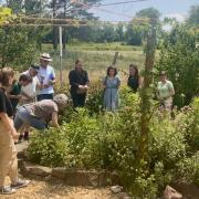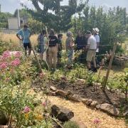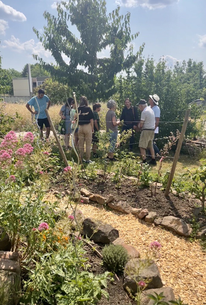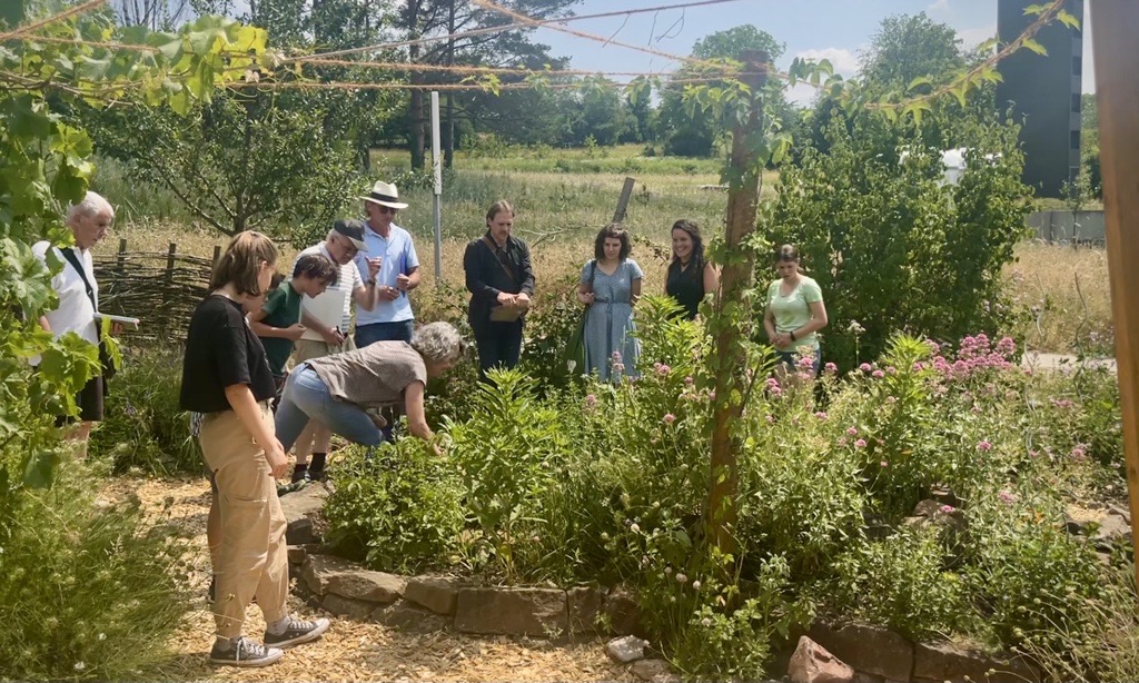 Beim Rundgang durch den abwechslungsreich gestalteten Garten ist all das gut nachvollziehbar. Auf verschiedenen Geländeniveaus laden die einzelnen Beete zu einer regelrechten Entdeckungsreise ein. Die Vielfalt der herkömmlichen, wie auch vieler seltenerer Obst-, Gemüse- oder Kräuterpflanzen entlocken beim nachmittäglichen Rundgang auf den gepflegt mit Holzschnitzeln belegten Gartenwegen auch den vier Kommissionsmitgliedern immer wieder Überraschungskommentare . Natürlich, möchte man fast sagen, gibt es eine Kräuterspirale; Hochbeete sind teilweise mit Sandstein-Bruch gebaut; die Tröpfchenbewässerung ist wohl durchdacht. Natürlich springt der Kommission die südamerikanische Anbautechnik Milpabeet ins Auge, das man sonst eigentlich von den Mayas kennt. Und Simon, dessen langjähriges AG-Engagement durch sein derzeitiges Abitur nunmehr in den Endzügen liegt, gibt gerne Auskunft, warum da an fachgerechten Gerüsten auf seine Initiative hin Hopfen in den Schulgarten der Heimschule gelangt.