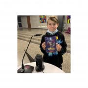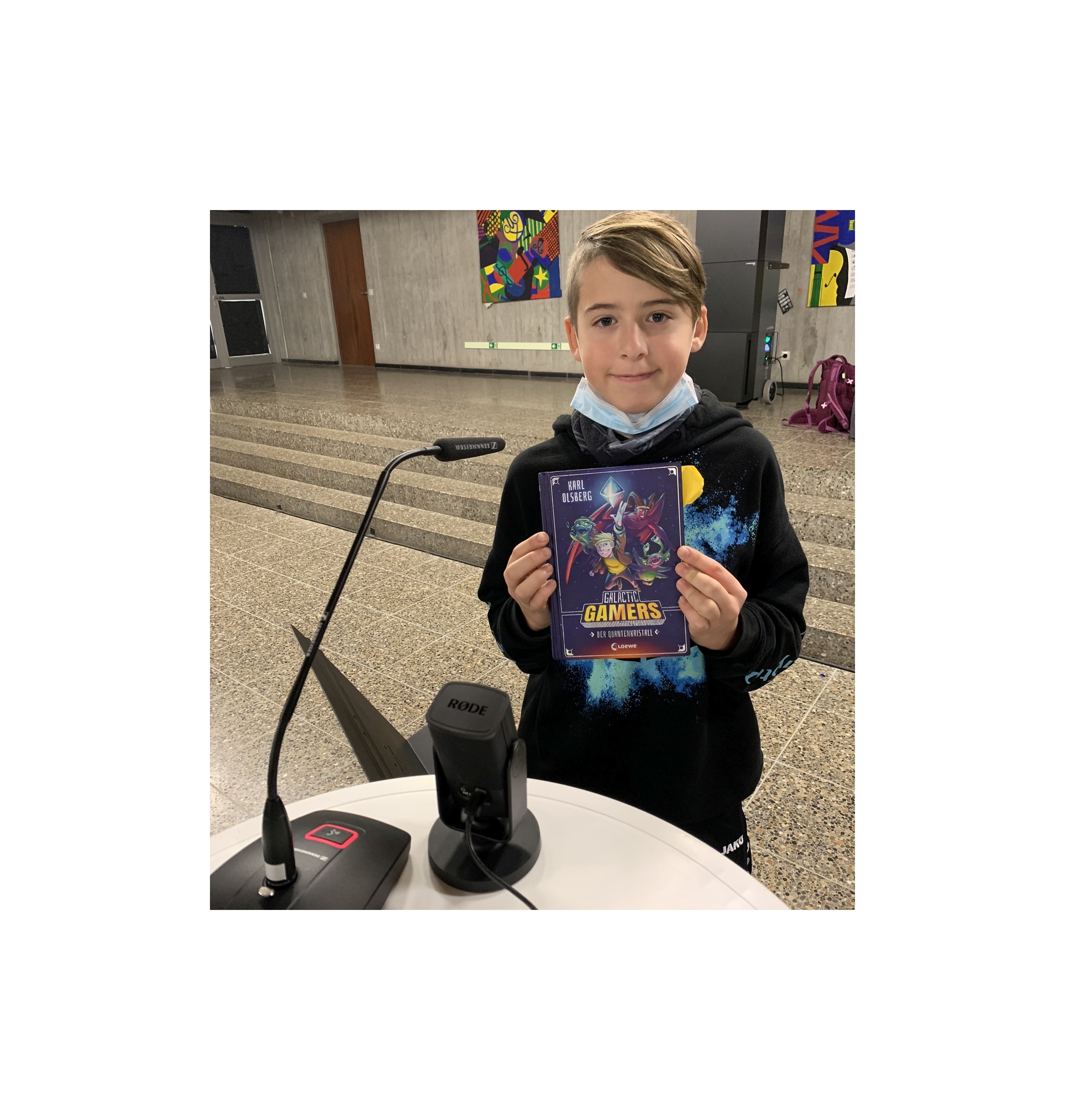 Dann war es so weit und der erste Aufnahmetag stand in den Startlöchern. Nils Greule, ein Mitarbeiter des PH-Radios, besuchte die Klasse mit gesamter Ausrüstung, da der Besuch im Studio aufgrund der aktuellen Coronapandemie leider nicht stattfinden konnte. Diese Tatsache tat der Stimmung an beiden Aufnahmetagen aber keinen Abbruch und kurzerhand verwandelte sich der Partyraum der Heimschule zweimal in ein Radiostudio, in dem die Schülerinnen und Schüler auf der Bühne ihre Bücher mit Stolz präsentierten und ihre Mitschülerinnen und Mitschüler in ihre Geschichte entführten. Nach jedem Vortrag gab es kurz Applaus und mit Hilfe von Notizen, die während des Vorlesens gemacht wurden, bekam der Vorleser bzw. die Vorleserin eine mündliche Bewertung der Zuhörerinnen und Zuhörer. Trotz der Situation, nachher im Radio ausgestrahlt zu werden und der damit verbundenen Aufregung, hat jede und jeder Einzelne der Klasse diese Herausforderung mit Bravour gemeistert. Und eine Radiosendung wäre natürlich keine vollständige Sendung, wenn es nicht auch Musik und eine Moderation geben würden, daher durften sich die Schülerinnen und Schüler zum Abschluss auch in diesen Bereichen noch kreativ ausleben.