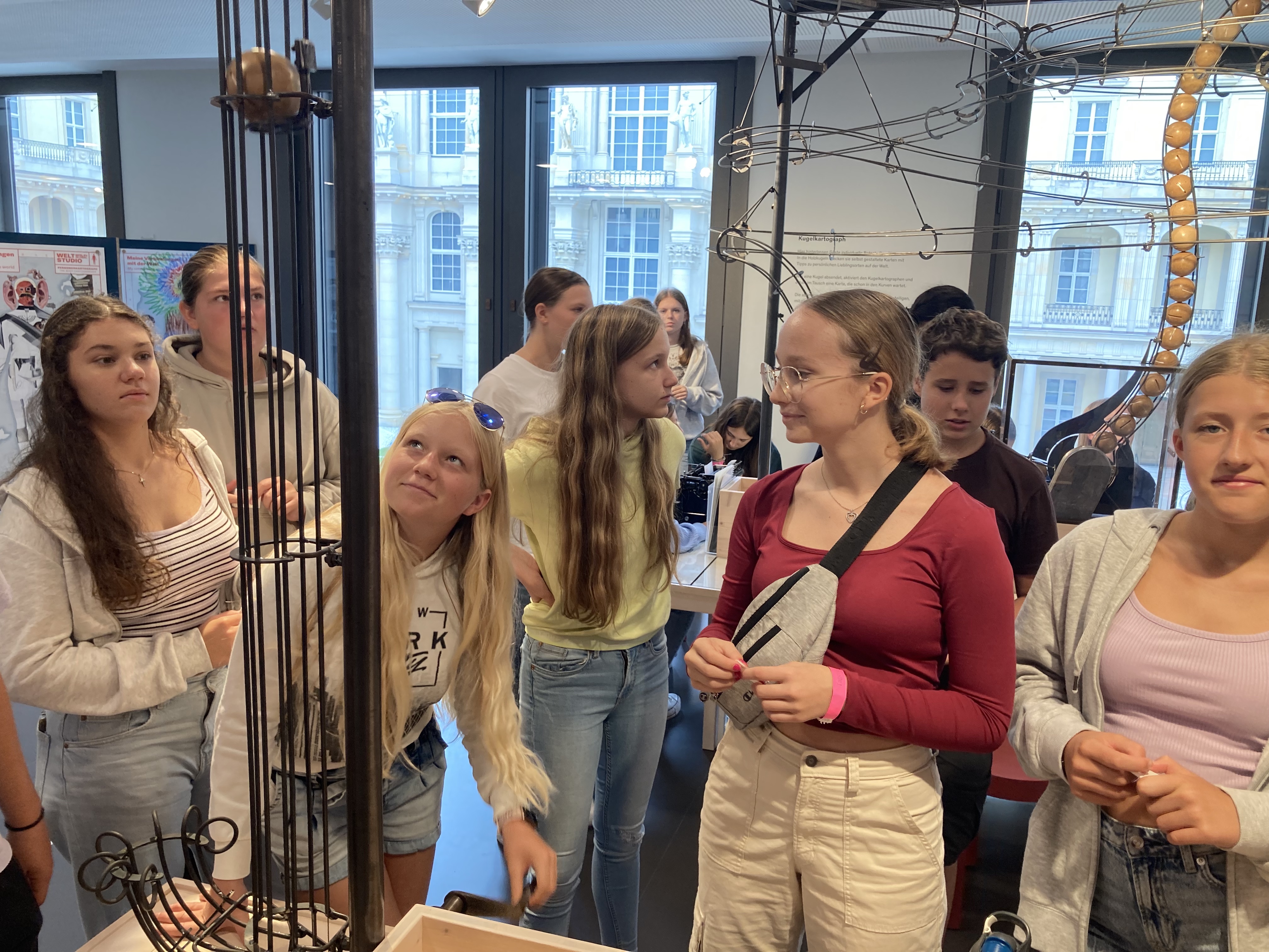 Am Mittwoch besichtigten wir den Alexanderplatz mit der Weltzeituhr und dem Fernsehturm, Berlins höchstes Gebäude mit 368 m. Hier fuhren wir mit dem Aufzug innerhalb von 40 Sekunden bis zur in 203 Metern hoch gelegenen Aussichtsetage und genossen den 360° Blick über Berlin. Die Mittagspause nutzten einige von uns zum Einkaufen, während andere gemeinsam mit den Lehrer*innen den Checkpoint Charlie, den ehemaligen Grenzübergang zwischen dem russischen und dem amerikanischen Sektor Berlins besichtigten. Am Nachmittag spazierten wir gemeinsam vorbei am Roten Rathaus, dem Sitz des Berliner Bürgermeisters Richtung Berliner Dom, Museumsinsel und Humboldt-Forum, wo wir die interaktive Ausstellung „Berlin Global“ besuchten. Abends fuhren wir dann zum Tempelhofer Feld, einem ehemaligen Flughafen von Berlin, dessen Gelände heute von den Berlinern für Sport- und Freizeitaktivitäten genutzt wird. Hier genossen wir (in voller Dunkelheit…) unser Abendessen.