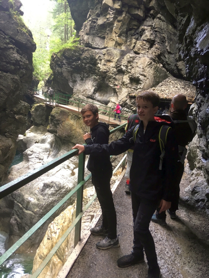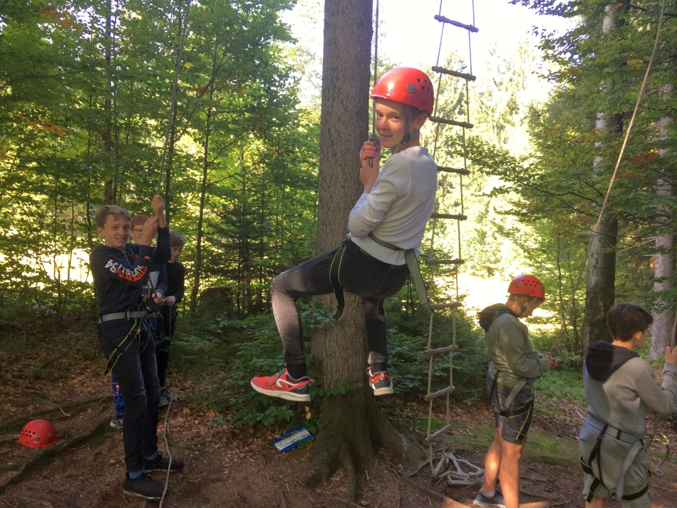 Nach einer kurzen Nacht ging es zu einer Orientierungsrallye in der näheren Umgebung. In zwei Gruppen zogen wir mit einer Rätselkarte und einem Kompass bewaffnet los. Am Ende der Strecke konnten wir uns von einer 20 Meter hohen Felswand abseilen und danach noch Oberstdorf erkunden. Abends saßen wir am gemütlichen Lagerfeuer. Am dritten Tag hieß es früh aufstehen, da eine Raftingtour auf der Iller anstand. In zwei großen Schlauchbooten erwarteten uns mehrere Aufgaben auf der zweistündigen Fahrt bei kühlem Wetter und eiskaltem Wasser. Kaum aufgewärmt ging es am Mittag in die Breitachklamm, eine wunderschöne Schlucht mit einem reißenden Fluss. Am Abend unternahmen wir zum Abschluss des Tages noch eine geführte Fackelwanderung. Am Donnerstag konnten wir im Tief- und Hochseilgarten einzeln und in der Gruppe unsere Grenzen austesten. Für einige galt es, ihre Höhenangst zu überwinden und die Grenzen der eigenen Kraft kennenzulernen. Eine weitere Herausforderung war es, den sichernden Partnern zu vertrauen. Mittags gab es die Möglichkeit, die nahe gelegene Skischanze zu besichtigen oder nach Oberstdorf zum Shoppen zu gehen.