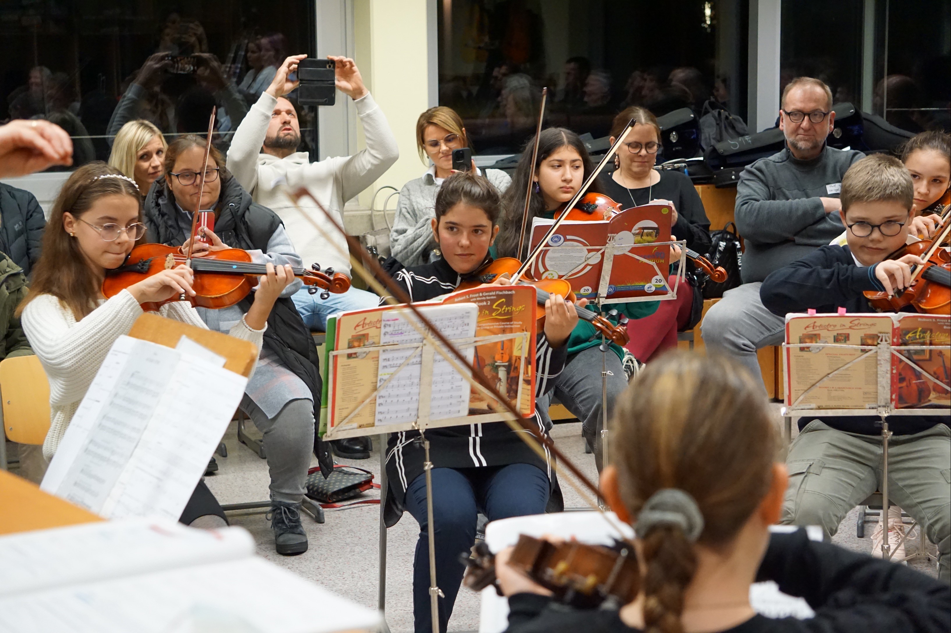 Den Anfang machte ein kleines Adventskonzert, welches von den Streichern aus der Klasse gegeben wurde. Begleitet wurden sie von der Musiklehrerin Susanne Albrecht und von dem Musiklehrer Werner Wittstock, welche die Streicher seit der 5. Klasse unterrichten. So durften sich die Eltern sowie Mitschülerinnen und -schüler über eine Streichinstrumentenversion von „Jingle Bells“ und anderen Advents- und Weihnachtsliedern freuen.