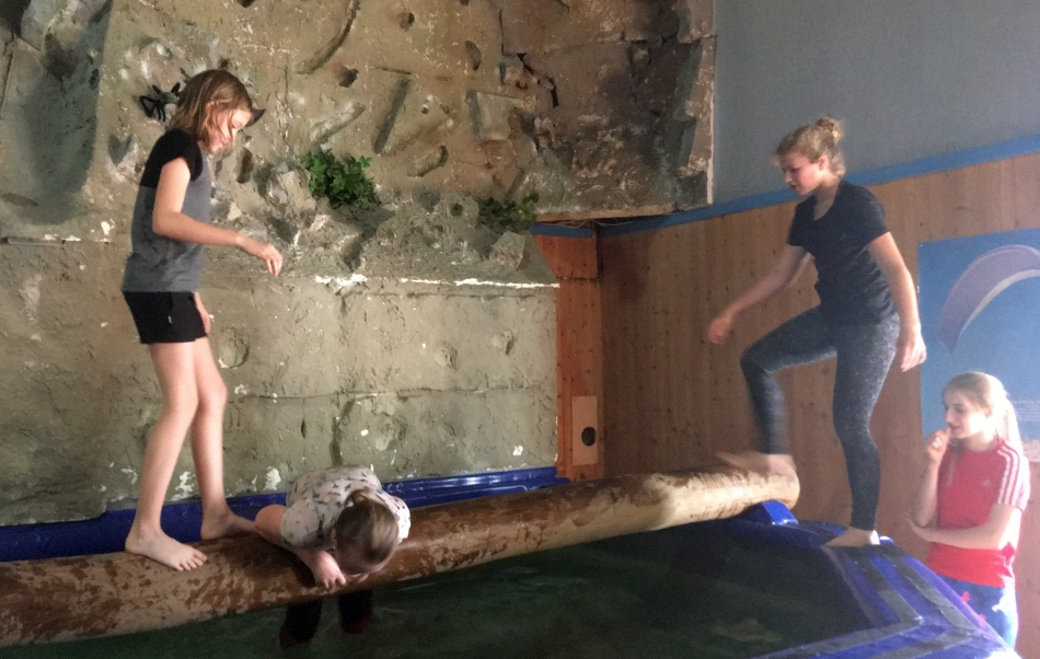 Die Himmelsleiter rauf, über die wackelige Hängebrücke, am Seil durch den Raum pendeln, über den Wassergraben und zum Schluss der Sprung vom Pampers-Pole – das waren nur einige der Aufgaben, die die 20 Schülerinnen und Schüler aus Realschule und Gymnasium im Rahmen der Kletter-AG beim gemeinsamen Ausflug in die Abenteuergarten der Emmendinger Kletterhalle zu absolvieren hatten. Alle Aufgaben hatten eines gemeinsam: Es war Teamwork gefragt! Nur gemeinsam konnte der Parcours, bei dem ein Rucksack fehlerfrei von einer Station zur nächsten transportiert werden musste, bewältigt werden. Wie auch beim Klettern und Sichern mussten alle füreinander Verantwortung übernehmen, doch auch gute Absprache war wichtig. Das Wichtigste aber: Jede Menge Spaß! So wundert es nicht, dass die am häufigsten gestellte Frage am Ende war: „Machen wir das nächstes Jahr wieder?“ – Aber sicher!