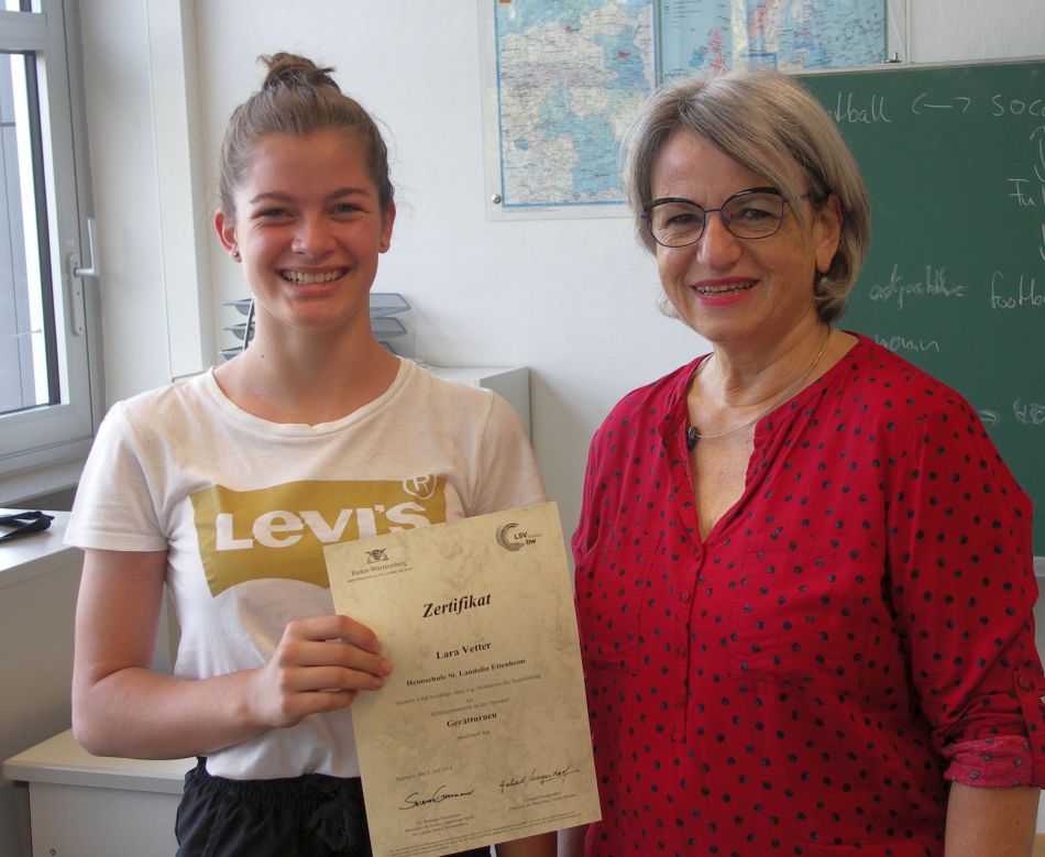 Nach absolvierter Ausbildung in der Sportart Geräteturnen konnte Realschulrektorin Ulrike Hugel der Schülerin Lara Vetter im Beisein ihrer Mitschülerinnen und Mitschüler das Zertifikat des Kultusministeriums überreichen. Lara, die derzeit die neunte Klasse der Realschule besucht, kann damit im neuen Schuljahr ihre Lehrerinnen und Lehrer im „Sportalltag der Schule“ unterstützen und gemeinsam mit ihnen Sportprojekte durchführen.