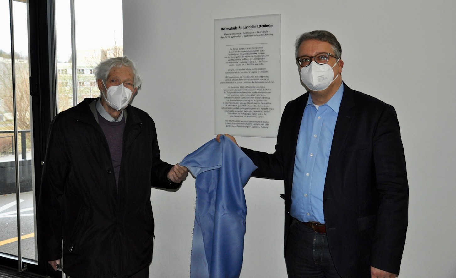 Im Jahr 2020 feierte die Heimschule St. Landolin ihr 100-jähriges Jubiläum, wobei die allermeisten Veranstaltungen zu diesem besonderen Anlass aufgrund der Covid-19-Pandemie bisher nicht stattfinden konnten. Nun übergab der Katholische Lehrbrüderverein Ettenheimmünster sein Jubiläumsgeschenk: Im Eingangsbereich der Schule wurde eine Tafel mit den wichtigsten Informationen zur Geschichte der Schule seit der Gründung durch die Lehrbrüder von Ettenheimmünster 1920 enthüllt.
