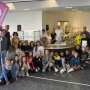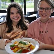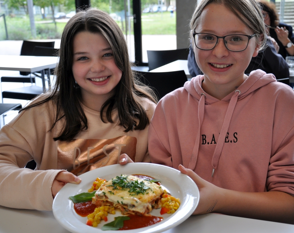 „Was hat mein Schnitzel mit dem Klimawandel zu tun?“ Unter dieser Leitfrage informierten sich alle Klassen am Morgen des 1. Oktober über die Bedeutung von Fleischproduktion und -konsum für den Klimawandel. Bereits auf dem Weg ins Klassenzimmer vorbei an der Mensa nahmen die meisten Schülerinnen und Schüler wahr, dass an diesem Tag etwas anders war: Ein Globus in der Mensa – dazu verschiedene Stellwände zum Thema Klimaschutz. Im Unterricht lieferten dann je nach Klassenstufe passende Infovideos oder Texte wichtige Fakten, etwa welche Folgen die Brandrodung von Wäldern zur Gewinnung von Weideland hat, und es gab Raum sich darüber auszutauschen. Ziel des Aktionstages war es, für die Gründe zu sensibilisieren, aus denen ab nun das Mensaangebot einmal in der Woche – an wechselnden Wochentagen – fleischfrei sein wird. An diesem Tag wurden zum Beispiel Rührei-Brötchen und Veggie-Burger anstelle von Fleischkäse und Schnitzel-Brötchen als Pausensnacks angeboten. Zum Mittagessen hatte das Küchenteam rund um Küchenleiter Uwe Zimmermann Gemüselasagne und Champignon-Risotto mit Gemüse und Trüffelsauce auf den Speiseplan gesetzt.