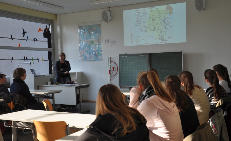 „Was verbindet ihr spontan mit dem Thema Flucht?“ Mit dieser Frage beginnt der Workshop im ersten Teil des Programms rund um den Missio-Truck. Die Schüler sammeln: Flüchtlinge, Asyl, Krise, Integration. In diesen Antworten spiegelt sich unsere europäische Perspektive auf das Thema. Im folgenden Gespräch wird die Lage afrikanischer Flüchtlinge beleuchtet – und zwar ganz konkret am Beispiel der Demokratischen Republik Kongo. Seit Jahrzehnten kommen die blutigen Konflikte in der ehemaligen belgischen Kolonie nicht zur Ruhe. Hintergrund ist der große Reichtum an seltenen Rohstoffen, wie zum Beispiel Cobalt. Dies wird in sämtlichen elektronischen Geräten, vor allem Handys, verbaut. Paramilitärische Rebellengruppen kämpfen um diese wertvollen Ressourcen – die großen Hersteller weltweit stehen am Ende der langen Handelskette, weil sie möglichst billig produzieren wollen. Unter diesen Verhältnissen leidet die Bevölkerung: Gewalt, Vertreibung, Versklavung, Kinderarbeit, Ausbeutung, Vergewaltigung. All diese Aspekte werden im Laufe des Workshops angesprochen. Grausame Schlagworte, die die Schüler ihren Assoziationen zum Thema Flucht hinzufügen müssen. In der abschließenden Diskussion über Möglichkeiten, diese Situation zu verändern, d.h. Fluchtursachen zu bekämpfen, wird deutlich, dass auch hier wir selbst gefragt sind: Braucht man alle zwei Jahre ein neues Handy? Muss es ein Handy der großen Anbieter sein? Welche Alternativen, wie zum Beispiel das „Fairphone“, gäbe es?