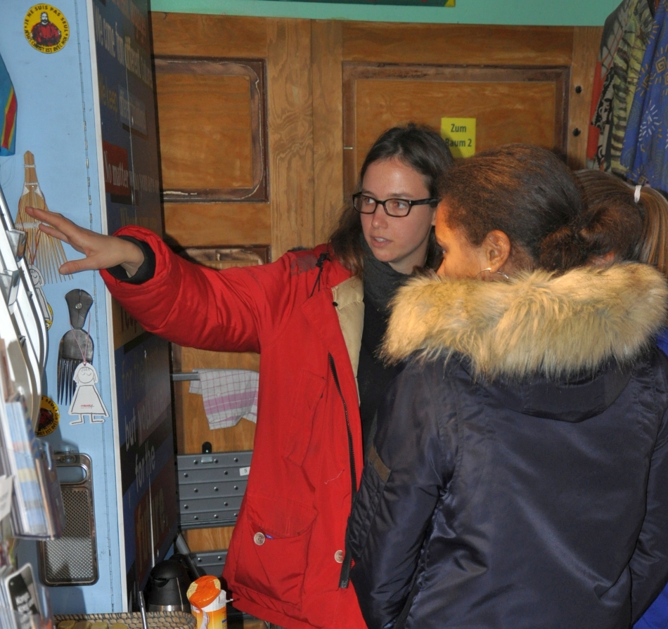 dsc_0234_0.jpgAnschließend besuchen die Schüler die Ausstellung im Missio-Truck selbst. Der kleine Rundgang ermöglicht einen ziemlich authentischen Perspektivwechsel in die Rolle eines kongolesischen Flüchtlings. Das Szenario beginnt auf einem Markt – doch plötzlich fallen Rebellen über das Dorf her. Schnell müssen sich die Schüler entscheiden, was sie mitnehmen: Kleidung, Adressbuch, Handy? Während der folgenden Simulation erlebt man, welche Folgen eine Fehlentscheidung hier haben kann. In der nächsten Stadt ist es unmöglich, eine Arbeit zu finden, hat man seine Zeugnisse nicht dabei. Und die Weiterreise in ein anderes Land? Nahezu ausgeschlossen, wenn man im Kampfgetümmel seinen Pass nicht mitgenommen hat. So lernt man in dieser Ausstellung, die Welt durch die Augen eines Flüchtlings zu sehen und erfährt nebenbei interessante Details über die Situation von Flüchtlingen auf der ganzen Welt.