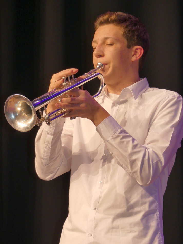 Den musikalischen Reigen eröffnete die Bläserklasse R7b mit den Stücken „Tyrannosaurus Charlie“ und mit „A Blues to grow on“. Für besonderen Übungsfleiß ernteten die Solisten Johannes Isele, Felix Breithaupt, Maxi Rommel und Florian Fischer den verdienten Applaus von Mitschülern und Verwandten. Der Bläserklassenlehrer Tobias Schulz und seine Musikkollegen waren von der Leistung der Klasse, die seit nur zwei Jahren gemeinsam musiziert, besonders beeindruckt.