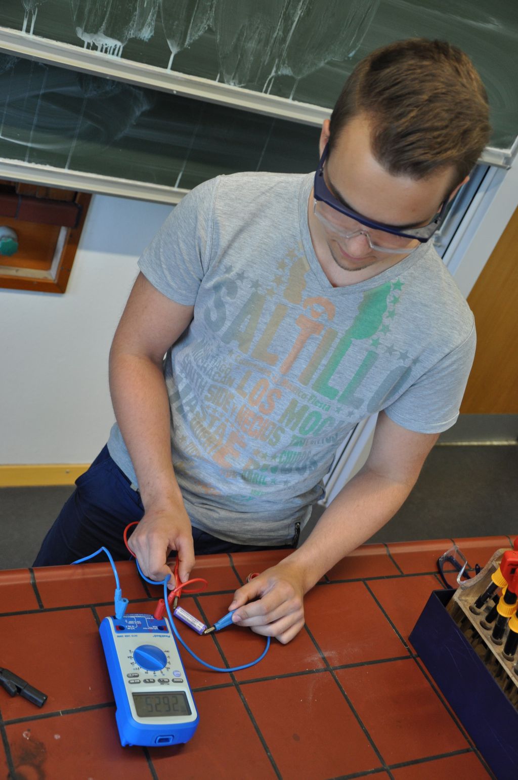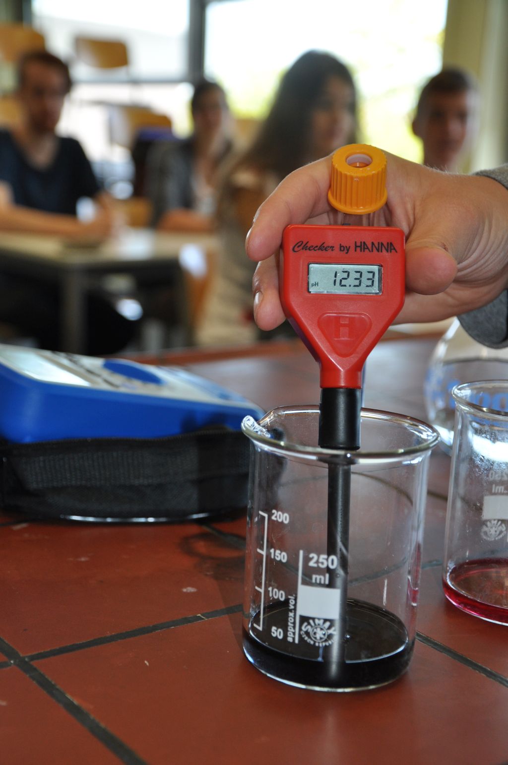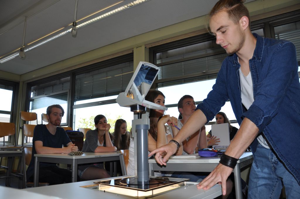 Durch die großzügige Förderung des Fonds der Chemischen Industrie konnten wir wiederholt Laborgerätschaften für das Praktikum wie Messgeräte, Büretten, Magnetrührer u.v.m. anschaffen. Neu angeschafft in diesem Jahr haben wir einen „Teachers Helper“, mit dem Messwerte und Übungen auf Smartphones der Schüler gesandt und dort mittels einer App bearbeitet werden können. Für das Praktikum haben wir pH-Meter angeschafft, mit denen sich einfach und exakt pH-Werte ermitteln lassen – mit den bereits angeschafften Büretten und Magnetrührern sind wir für Titrationen (Wie viel Säure ist im Essig?) nun bestens ausgerüstet. Die neuen Multimeter ermöglichen das Erfassen zahlreicher Messdaten und das Polarimeter für den Overheadprojektor ermöglicht das Messen und Veranschaulichen der optischen Aktivität (hat mit der links- oder rechtsdrehenden Milchsäure zu tun, kennt man von den Angaben auf dem Joghurtbecher…).