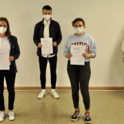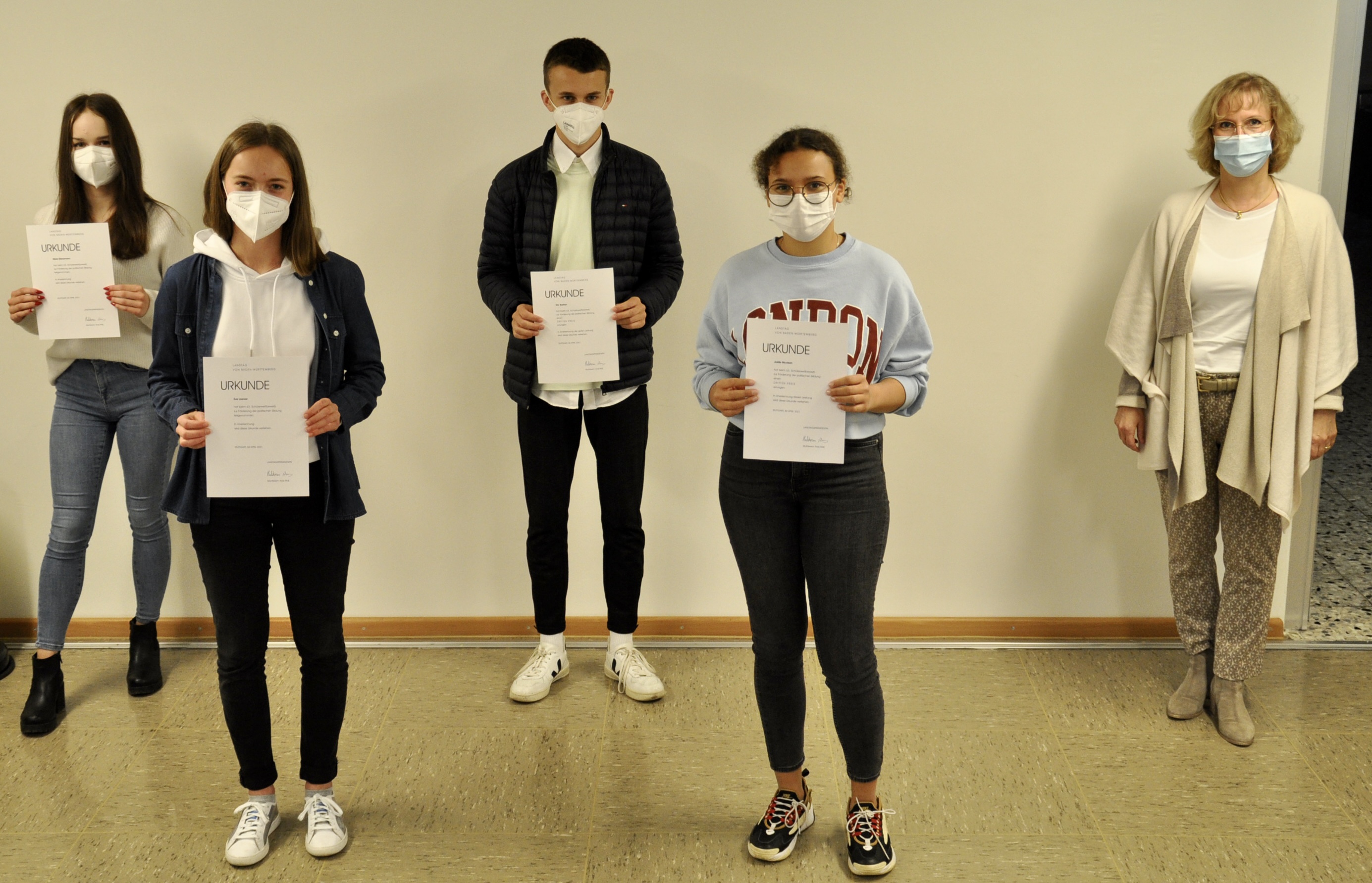 „komm heraus, mach mit.“ Unter diesem Motto stand der diesjährige Schülerwettbewerb des Landtags von Baden-Württemberg zur Förderung der politischen Bildung. Joëlle Nicolson (R10d), Mara Glanzmann, Eva Loewer und Eric Bastian (alle J1) haben sich mit sehr unterschiedlichen Beiträgen daran beteiligt und bekamen dafür Urkunden und Preise überreicht. Mara und Eva starteten zum Thema „No future? Ideen, Ängste und Hoffnungen von Menschen in eurem Alter“ eine Umfrage zur Haltung von Jugendlichen gegenüber der Digitalisierung. Joëlle verfasste einen Kommentar zum Thema Rassismus und bekam dafür den 3. Platz zuerkannt. Bastian beschäftigte sich in einer Facharbeit mit der Frage, ob die Europäische Union eine echte Gemeinschaft oder nur noch ein Name ist. Diese Arbeit wurde mit dem 2. Platz ausgezeichnet. Im Rahmen der Preisverleihung blickten die begleitenden Lehrer Holger Gißler und Jakob Katzmann mit Schülerinnen und Schüler auf ihre Arbeit zurück.