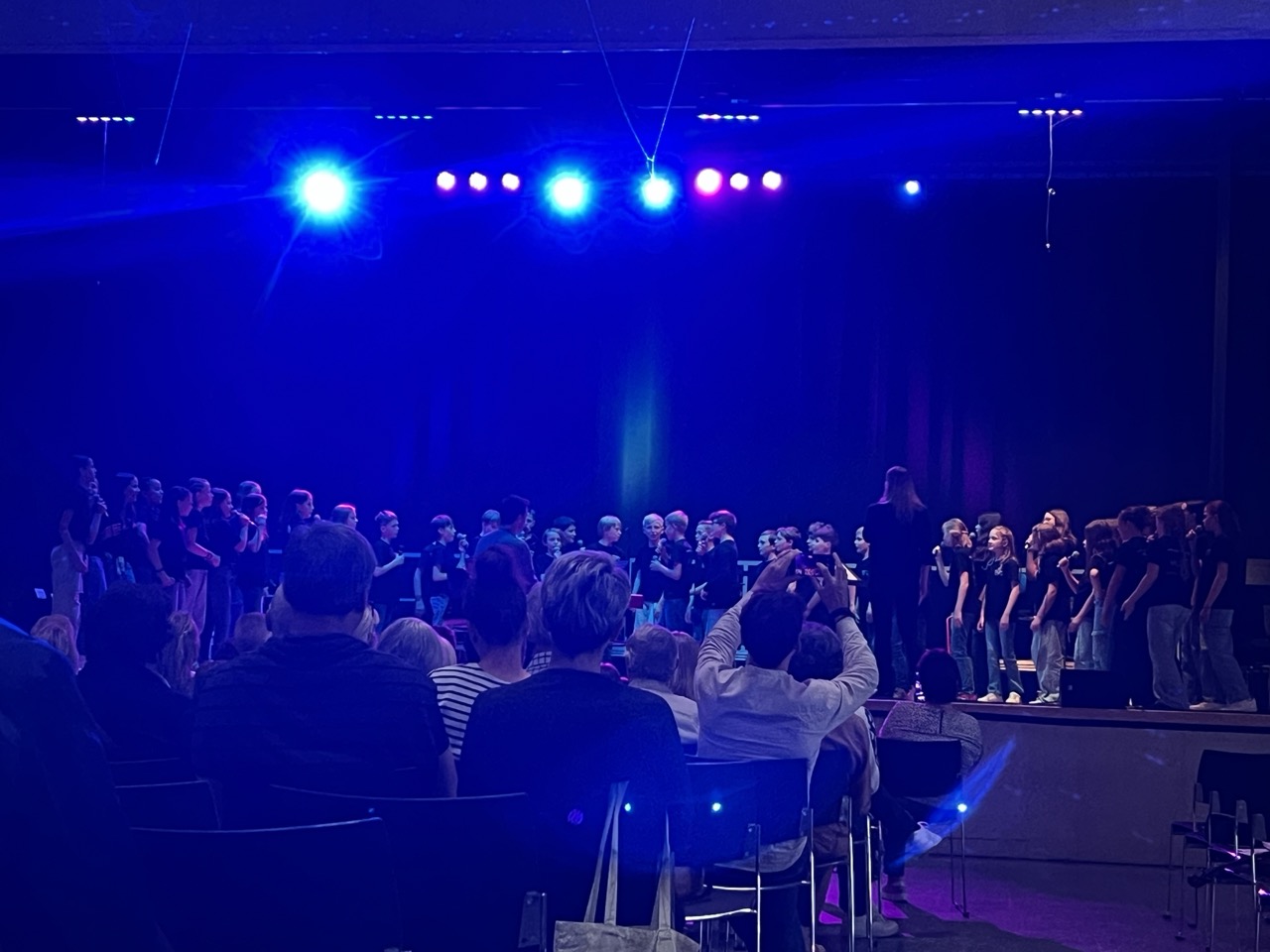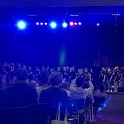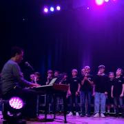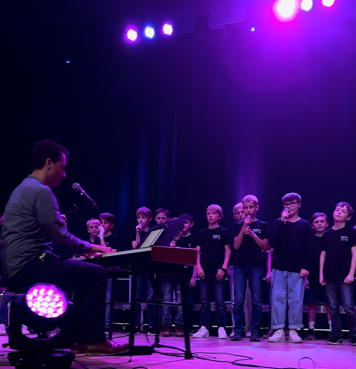 Das fulminante Finale des Abends aber besorgte der erst jüngst aus der Taufe gehobene Unterstufen-Chor „Build your voice“, als Auswahl-Chor hervorgegangen aus der Chorklassen-Aufbauphase unter Leitung von Patrick Heil (mit zupackendem Drive am E-Piano) und Lara Grobshäuser (ebenso als inspirierende Gesangs-Solistin). Hervorragend war es beiden Musikpädagogen als professionellem Tandem gelungen, die sich erst neu auf stimmliche Abenteuer einlassenden kleinen Sängerinnen und Sänger in kurzer Zeit zu einem swingenden Gesamt-Ensemble zusammenzuschweißen. Dabei kontrastierten besinnliche Melodien etwa des volkstümlichen Abendliedes von Matthias Claudius („Der Mond ist aufgegangen“) oder finnischer Folklore mit saalerschütternden Hits aus der Fußball-Arena wie „Seite an Seite - wir sind united“ oder der abschließend donnernden Grönemeyer-Hymne „Kinder an die Macht“.