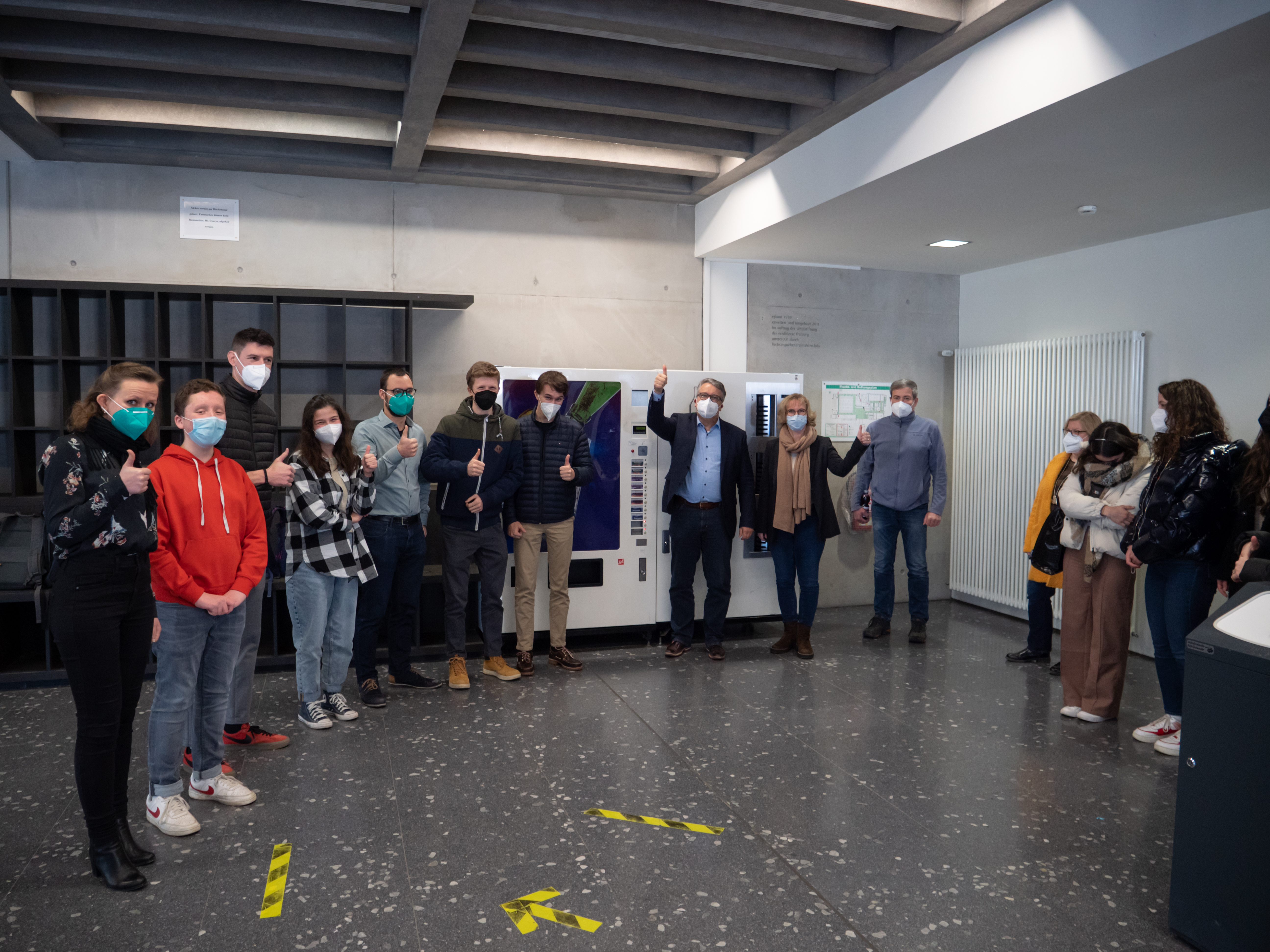 Bei der Einweihung bedankte sich Gymnasialleiter Eberhard Pfister bei Kristina Busam (Verwaltungsleitung), Norbert Matros (Technische Leitung) und Christian Winterer (Hausmeister) für die Hilfe bei der Umsetzung dieses Schülerbudget-Projekts und benutzte den Automaten anschließend das erste Mal, um ein Johannisbeerschorle zu kaufen.