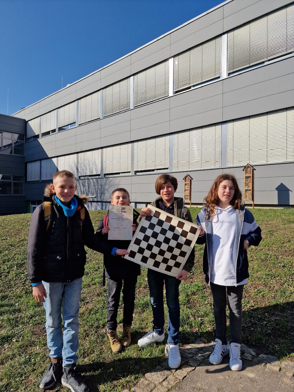 In der Wertungsklasse IV (bis Jahrgang 2010) konnten Mika Gerber (G06a), Leon Gassmann (G06a), Jannik Ruppel (G06c) und Sebastian Kleinstück (G06a) in Bad Krozingen einen hervorragenden 2. Platz in einem Teilnehmerfeld von insgesamt sechs Mannschaften erreichen. Allein die Mannschaft des Theodor-Heuss-Gymnasiums aus Freiburg – im vergangenen Jahr bei der badischen Meisterschaft vertreten – konnte unserem Team noch vorhandene Grenzen aufzeigen. Topscorer war Mika Gerber am ersten Brett, der vier von fünf Partien gewinnen konnte.