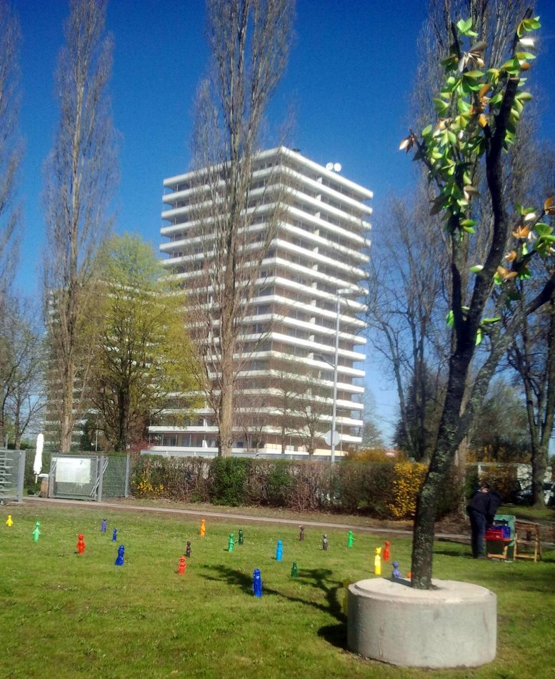 Technisch unterstützt von Herrn Betzle, Ingenieur der neuen Landesgartenschaubrücke, konnte die Eiche in einem Betonsockel von einer Tonne Gewicht sicher von drei erfahrenen Männern aufgestellt werden. Wenn die Blüten und Blätter im Wind rauschen ist das für die Schüler und hoffentlich auch für die Besucher eine besondere Erfahrung. Die Schulkunstaustellung ist über das mittlere der fünf Hochhäuser in der Römerstraße kostenlos zugänglich.