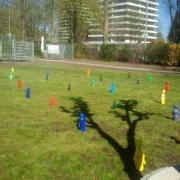 Hier streben die bunten Flaschenmenschen der Klasse R7a von Sabine Wagner, zum Teil halb in der Erde vergraben, auf den Blütenbaum der Kunst -AG von Anita Gast zu. Mit Papier, Kleister und Farbe haben die Siebtklässler Flaschen in phantasievolle Flaschenmenschen verwandelt. Die Idee dazu lieferte die Installation „Another Place“ des englischen Bildhauers Anthony Gormley: 100 gusseiserne Männer, die am Strand nördlich von Liverpool über eine Länge von drei Kilometern verstreut, alle in Richtung Meer blickend, zum Teil im Sand vergraben, zum Teil zwischen den Wellen verschwunden sind.