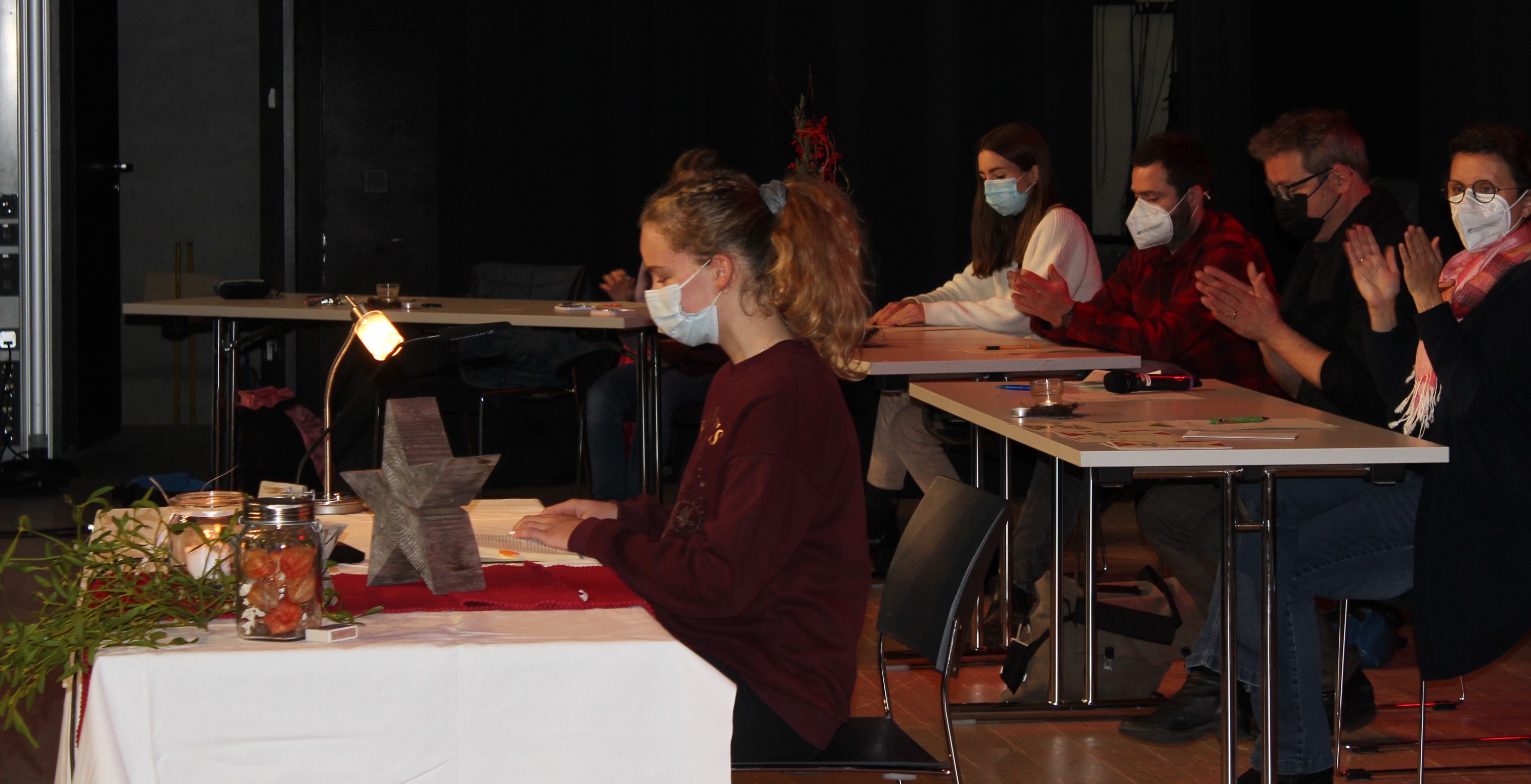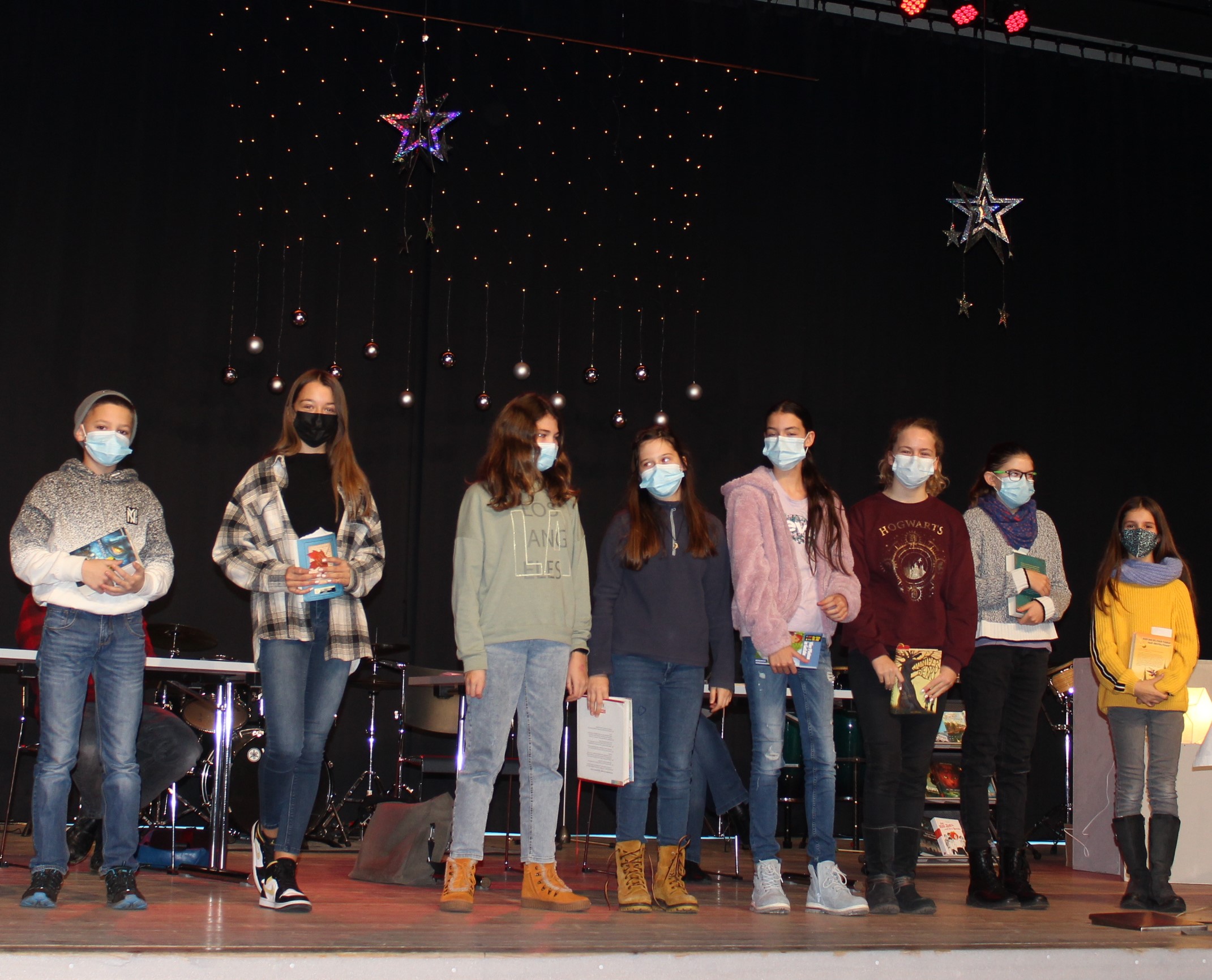 Zunächst wurden während der letzten Wochen innerhalb der einzelnen Klasse kleine eigene Wettbewerbe durchgeführt, sodass jede Klasse zwei Teilnehmer ins Rennen um den Schulsiegertitel schicken konnte. Am Freitag, den 3. Dezemebr 2021 war es dann wieder soweit und in der weihnachtlich geschmückten und stimmungsvoll beleuchteten Aula konnte der Vorlesewettbewerb starten.
