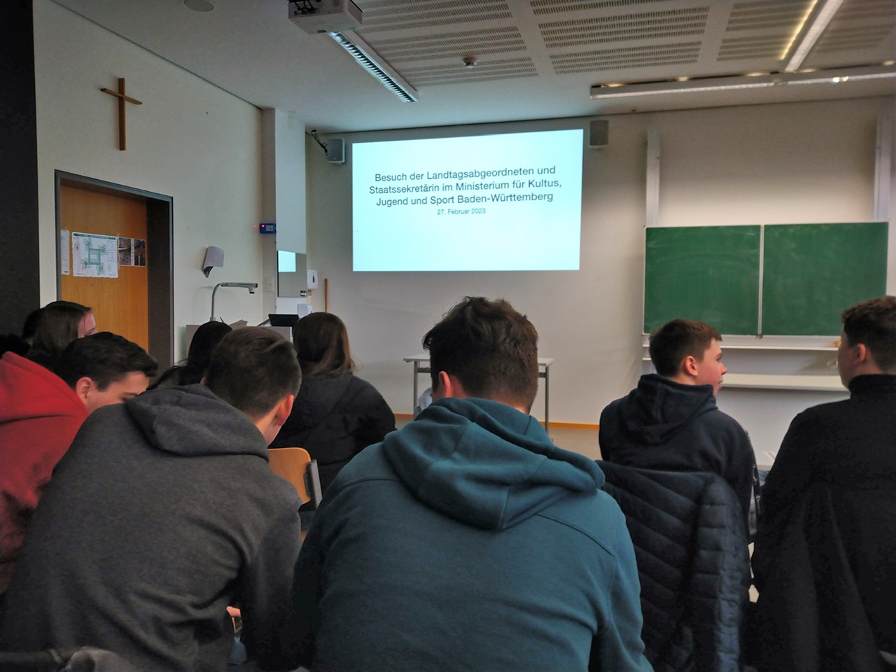 Sandra Boser, Landtagsabgeordnete und Staatssekretärin für Kultus, Jugend und Sport besucht die Klassen R10c und R10d der Realschule
