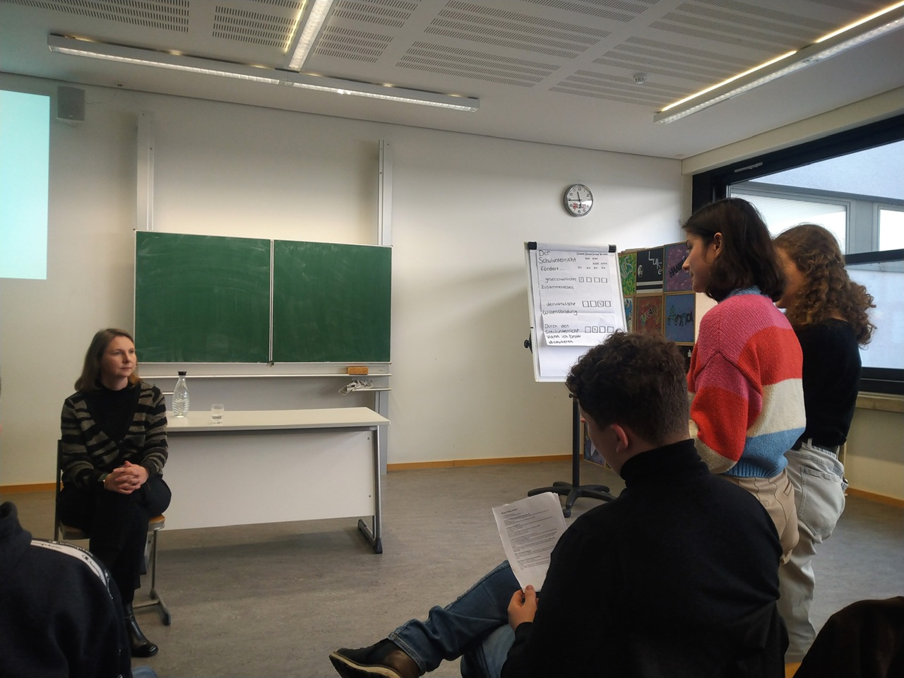 Auf die abschließende Frage, welche Note sie der Demokratiebildung in der Realschule geben würde, antwortete Frau Boser: „Trotz einzelner Lücken würde ich ihr gerne eine 2 geben, auch wenn es sicher noch viel daran zu arbeiten und verbessern gibt.“ Mit diesen Worten endete ein eindrücklicher Austausch, der für die Demokratiebildung ein wichtiger Baustein ist. Wir danken Sandra Boser herzlich, dass sie sich trotz Erkältung Zeit für uns genommen hat und für den interessanten Vormittag!