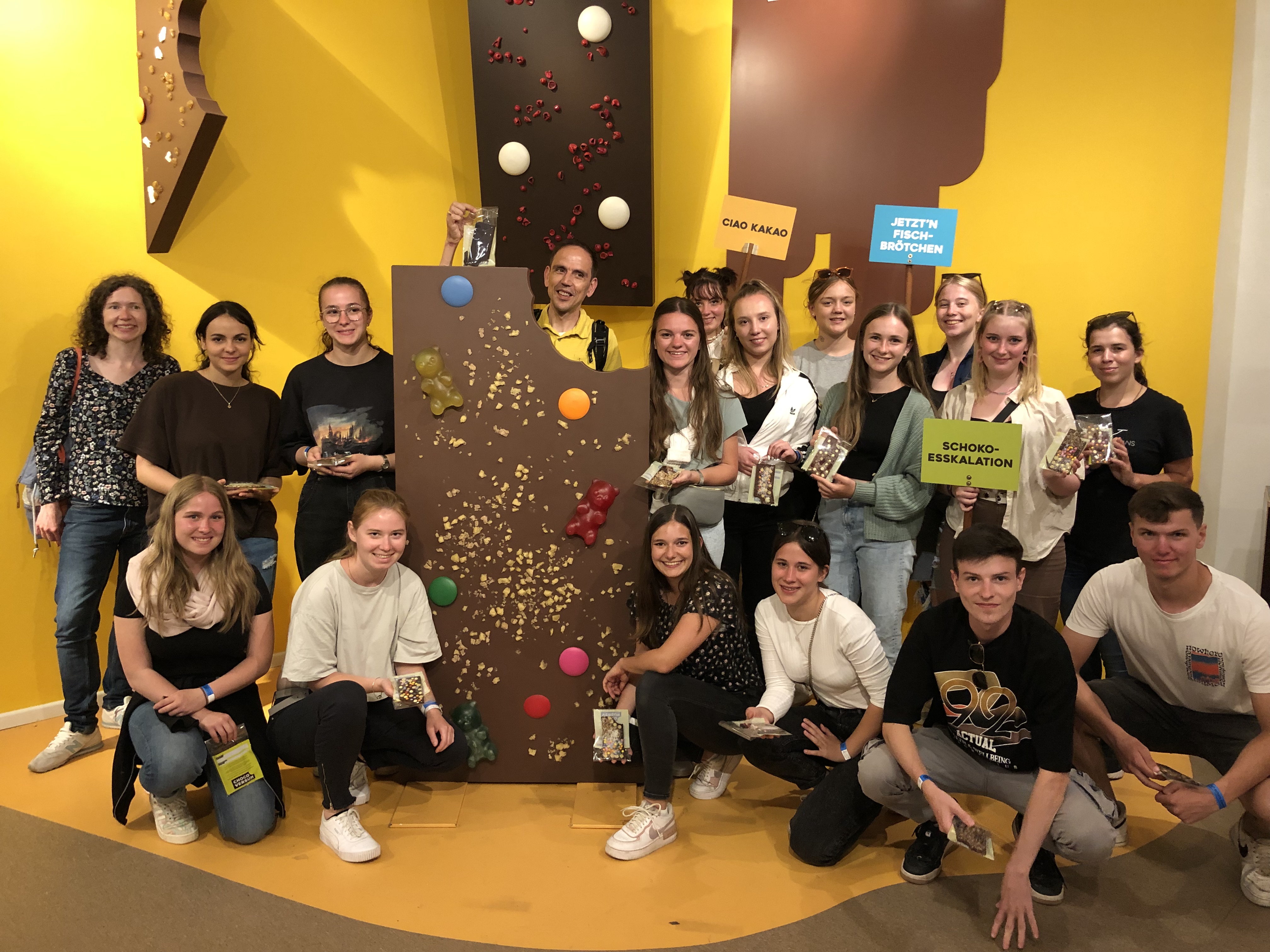 Neben den gemeinsamen Ausflugszielen mit den Parallelklassen erlebten wir von der S13a noch drei weitere beeindruckende Highlights: Eines davon war das Hachez Schokomuseum – genannt Chocoversum: Dort kreierten wir zum einen unsere eigene Schokolade, bekamen aber auch Einblicke, wie Anbau und Ernte einer Kakaobohne ablaufen und wie der Kakao bis hin zur Schokolade ver- und bearbeitet wird. Wir können nur sagen: „Rettet die Erde! Sie ist der einzige Planet mit Schokolade.“