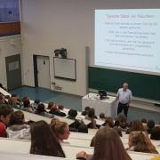 Am Ende seines Vortrages stellte uns Dr. Leifert einen Patienten aus der Klinik vor, dem wir Fragen stellen durften. Wir haben über seine Rauchgewohnheiten von früher (25 Zigaretten pro Tag über 30 Jahre lang), seine unzähligen gescheiterten Versuche aufzuhören und seine Familie (Frau und vier Kinder, früher auch alles Raucher, jetzt nur noch zwei Kinder) einiges Interessantes erfahren. Momentan versucht er erneut, von der Sucht loszukommen.