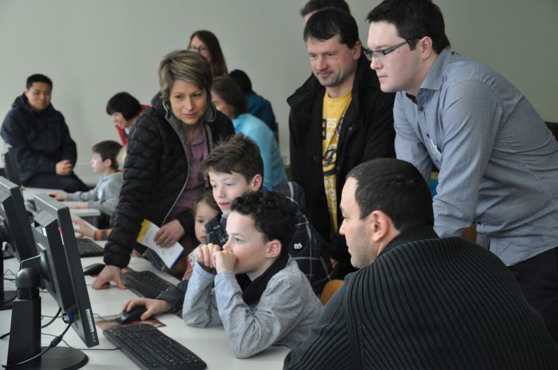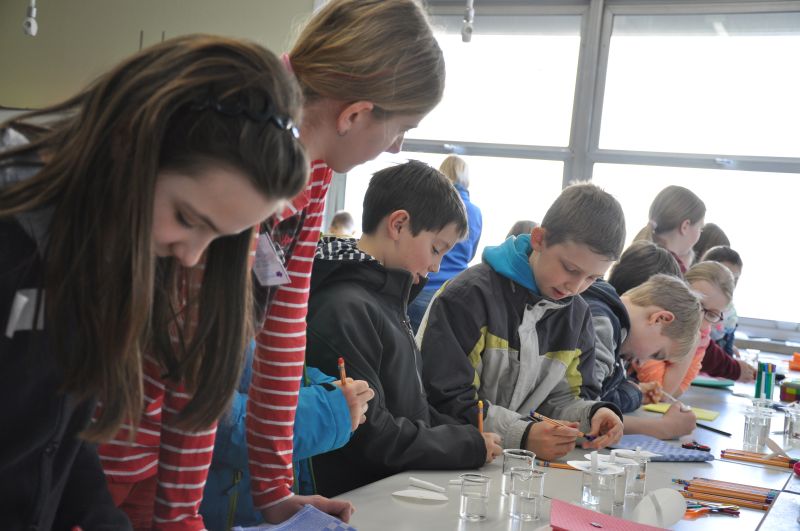 Nach der Begrüßung hatten die Besucher die Möglichkeit, unter der Führung von Schülern der Klassen R7a und R7e das Schulhaus zu erkunden. Die Fachbereiche Englisch und Französisch präsentierten von den Schülern einstudierte Theaterstücke, während im Fach Deutsch unter dem Thema „Keine Panik vor Grammatik“ Lernspiele ausprobiert werden konnten. Lern- und Wissensspiele wurden ebenfalls im Fach Geschichte präsentiert und von den Viertklässlern gespielt. Im Fachbereich Technik waren Werkstücke aus den letzten Jahren ausgestellt. Der Fachbereich NWA präsentierten Versuche aus verschiedenen Naturwissenschaftlichen Bereichen, bei denen die Besucher ihren Forscherdrang entfalten konnten. Die Turnhalle gehörte den Tänzern und Akrobaten der Realschule. In den Musikräumen wurde ein Cajon-Workshop angeboten. In vielen anderen Bereichen, wie EWG und Mathematik, konnten die Schüler und Eltern einen Einblick in die verwendeten Medien und Materialien bekommen.