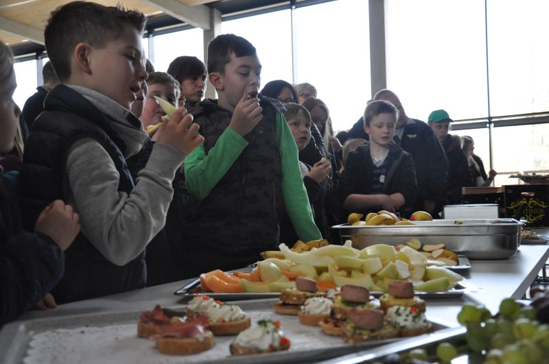 Mit all diesen Eindrücken sammelten sich alle Besucherinnen und Besucher schließlich wieder in der Aula, wo ein Büffet von Küchenchef Reinhard Mussler und seinem Team wartete. Dies bot einen guten Rahmen, um sich über den Tag auszutauschen und – wieder durch eigenes Probieren – auch die letzten offenen Fragen zu klären, nämlich zum täglich frischen Angebot der Heimschulmensa.