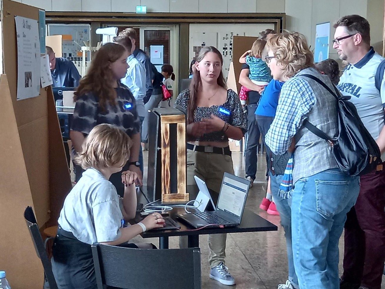 Die Gruppe der Mädchen war besonders fleißig. Als andere in den Ferien am Strand entspannten, bereiteten sich Luisa, Leonie, Rebecca und Finja auf ihre Präsentation vor. Das bedeutete ein Video über das Projekt zu erstellen, die restlichen Bewerbungsunterlagen einzureichen und aus dem anfänglichen Modell (Karton und Styropor) musste ein reisefähiges und wettbewerbsfähiges Modell aus Holz gebaut werden. Die Elektronik, die mit Aduino programmiert wurde, konnte zum Glück vom ursprünglichen Modell übernommen werden.